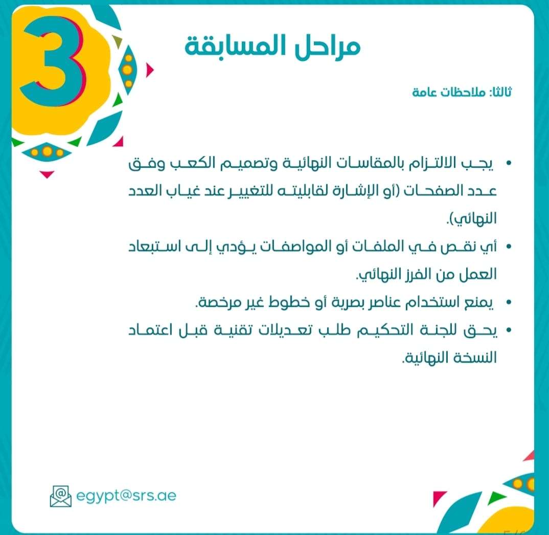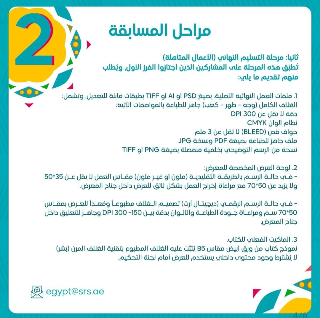 كما يجب إرسال 3 صور عالية الجودة لمراحل الرسم من ضمنها الصورة النهائية، كما يتعين على المتسابق -حال فوزه- أن يجهز العمل الفني للعرض بشكل لائق خلال معرض الكتاب 2026.