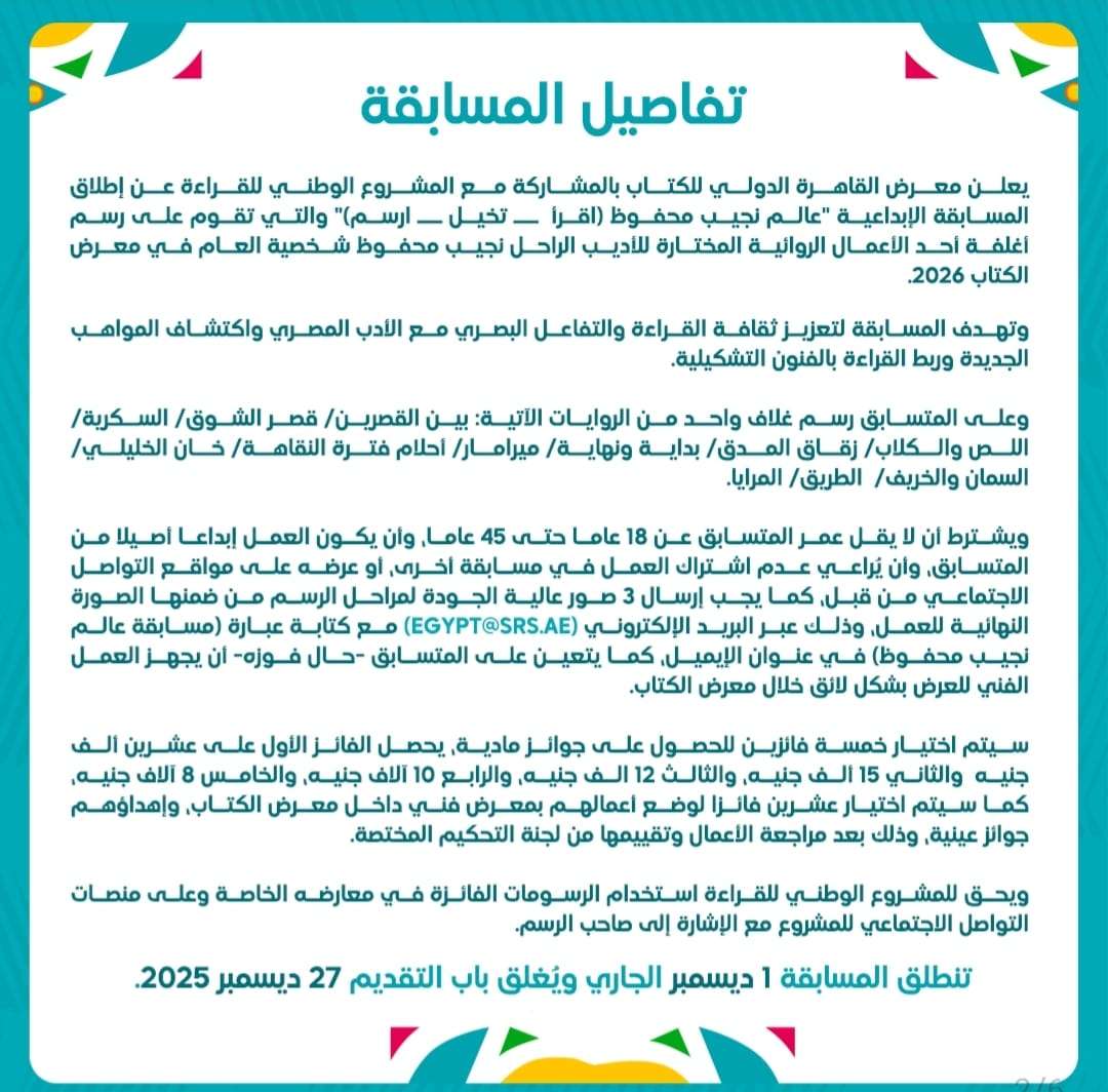 في إطار الاحتفاء بالأديب العالمي نجيب محفوظ، شخصية العام لمعرض القاهرة الدولي للكتاب 2026، تطلق الهيئة المصرية العامة للكتاب بالشراكة مع "البحث العلمي للاستثمار" الراعية للمشروع الوطني للقراءة مسابقة "عالم نجيب محفوظ" الموجهة للمواهب الفنية الشابة، بهدف تعزيز ثقافة القراءة وربط الأدب المصري بالفنون البصرية، حيث يبدأ التقديم للمسابقة من اليوم، ويستمر حتى 27 ديسمبر الجاري، على أن يتم توزيع الجوائز خلال فعاليات معرض القاهرة الدولي للكتاب.