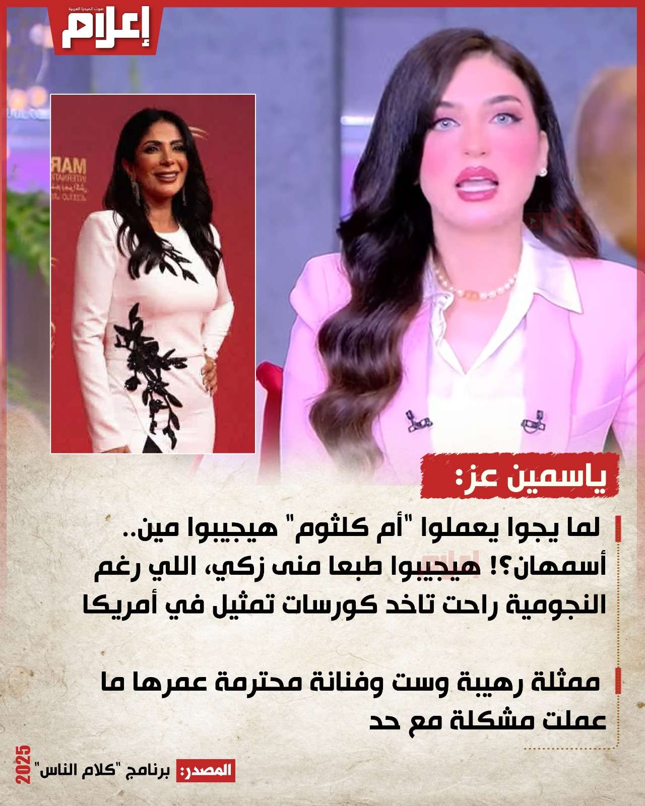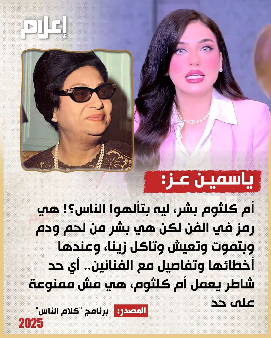أكدت "عز" خلال تقديمها برنامج "كلام الناس"، المذاع عبر شاشة "MBC مصر"، أن بعض المتابعين يتعاملون مع أم كلثوم كرمز مقدس، رغم أنها -على حد وصفها - “بشر زيّنا”، لها حياتها وتفاصيلها وأخطائها، ولا يجوز وضعها في مرتبة أعلى من الطبيعة البشرية.