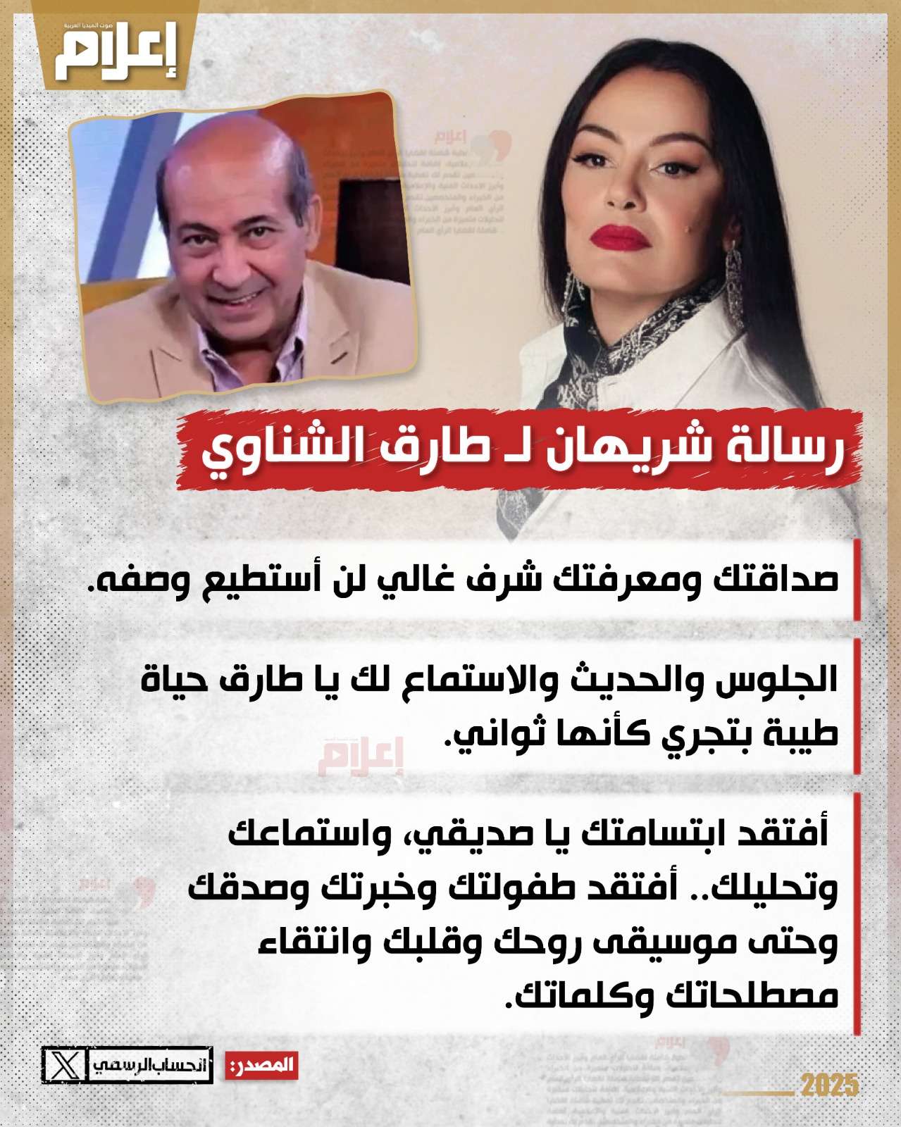 نشرت "شريهان" الرسالة عبر حسابها الشخصي على موقع "إكس" وجاء فيها الآتي: "صداقتك ومعرفتك شرف غالي لن أستطيع وصفه أو شرحه حتى لك أنت شخصياً يا صديقي الصادق المُقرب، وأضع تحت كلمة صديق ألف خط وخط وخط".