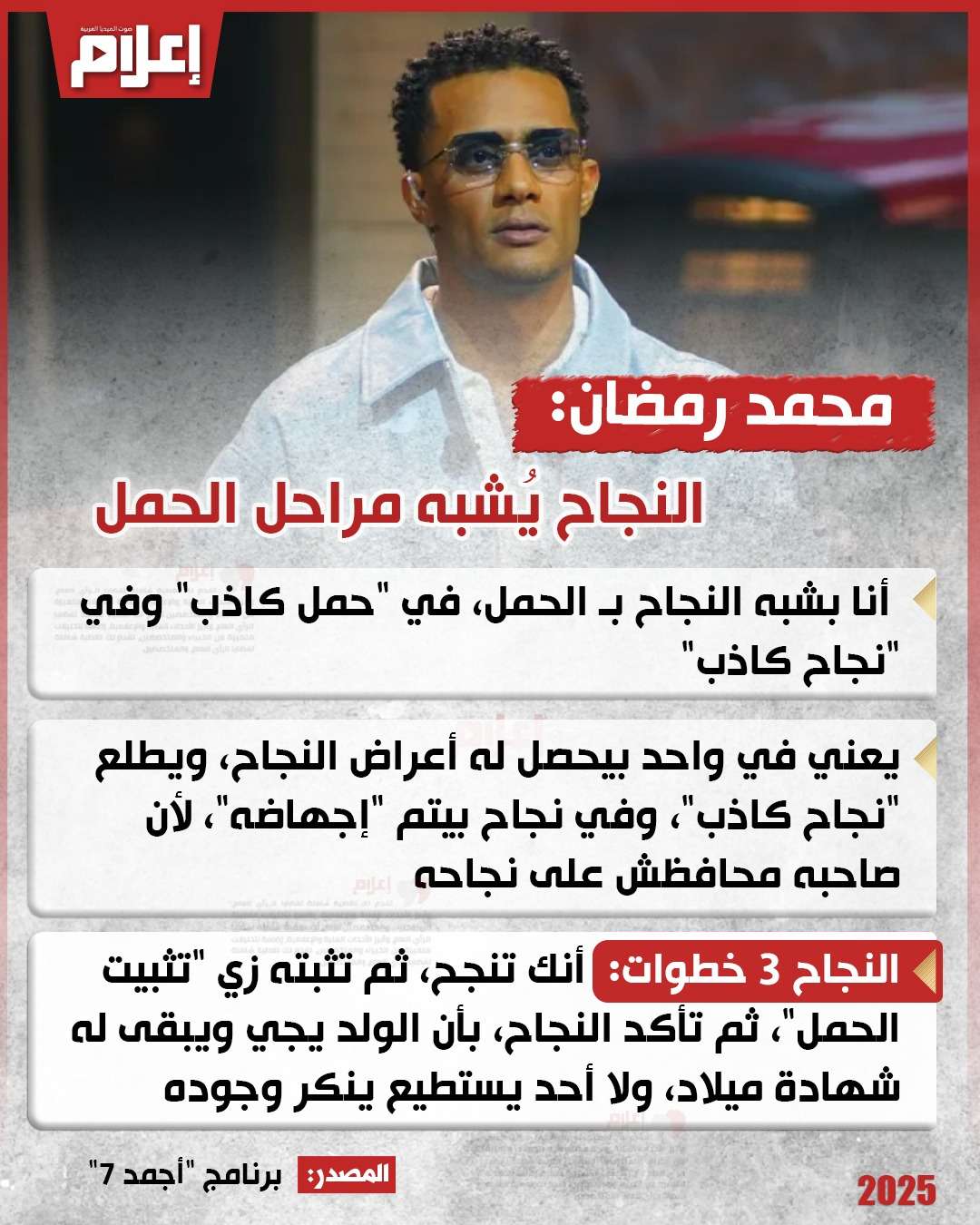 كما تحدث "رمضان" عن سر خلطة النجاح، مشيرًا إلى أنه يرى أن النجاح أشبه بمراحل الحمل، فهناك "نجاح كاذب" كـ "الحمل الكاذب"، مفسرًا حديثه بأن قد يظهر على أحدهما أعراض النجاح ويتنبأ له الجميع بمستقبل ونجاح باهر، لكن يتضح فيما بعد أنه "نجاح كاذب"، كما يوجد نجاح "يتم إجهاضه" -على حد تعبيره-، مؤكدًا أن ذلك يحدث حين لا يحافظ صاحبه على استمرارية نجاحه.