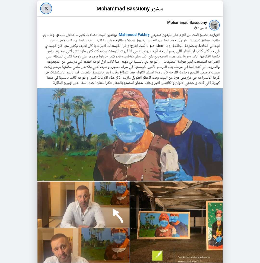 نشر "بسيوني" مجموعة اللوحات عبر حسابه على فيسبوك وعلق كاتبا: "النهاردة الصبح لقيت اتصالات كتير مكنتش سامعها وانا نايم ولقيت منشنز كتير على فيديو أحمد السقا بيتكلم عن ليفربول وصلاح واللوحة في الخلفية.. احمد السقا يمتلك مجموعه من لوحاتي الخاصة بمجموعة الجائحة أو pandemic، قمت أتفرج وأقرأ الكومنتات كتير منها كان لطيف وكتير منها كان كوميدي في حد كان كاتب إن الفنان اللي رسم اللوحة أكيد مريض نفسي، انا قريت الكومنت وضحكت كتير مزعلتش لأني صحيح مؤمن بكمية الفكاهة غير المبررة عند عموم المصريين لكن أكيد مش هغضب منه وكتير حاولوا يرموها على زوجة الفنان السابقة بس الصراحة استمتعت كتير بقراءة التعليقات".