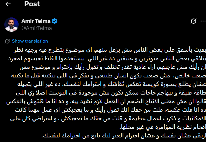 وقال طعيمة، في منشور عبر حسابه الرسمي على X، إنه لم يعد يشعر بالغضب من الهجوم الذي يتعرض له بقدر ما يشعر بالشفقة على بعض المتفاعلين، مشيرًا إلى أن طرح أي وجهة نظر أصبح يقابَل بتوتر وعدوانية، واستخدام ألفاظ مسيئة، لمجرد أن الرأي المطروح لا يروق للبعض.