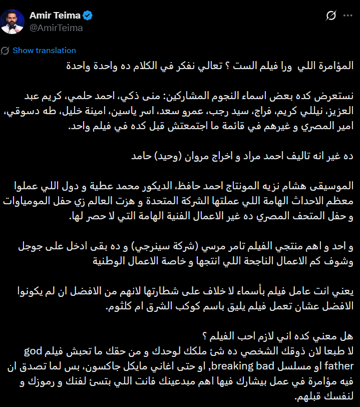 وكان طعيمة قد شارك متابعيه منشورًا يوضح فيه وجهة نظره تجاه ما تردد عن وجود "مؤامرة" خلف الفيلم، داعيًا إلى التفكير الهادئ في الأمر. واستعرض خلال منشوره أسماء المشاركين في العمل، مشيرًا إلى أنه يضم نخبة كبيرة من نجوم الصف الأول، من بينهم منى زكي، أحمد حلمي، كريم عبد العزيز، نيللي كريم، محمد فراج، سيد رجب، عمرو سعد، آسر ياسين، أمينة خليل، طه دسوقي، أمير المصري وغيرهم، في تركيبة نادرة لم تجتمع من قبل في فيلم واحد.