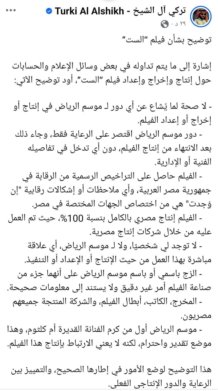كتب "آل الشيخ" عبر حسابه بموقع التواصل الاجتماعي "فيس بوك": "توضيح بشأن فيلم (الست).. إشارة إلى ما يتم تداوله في بعض وسائل الإعلام والحسابات حول إنتاج وإخراج وإعداد فيلم (الست)، أود توضيح الآتي: