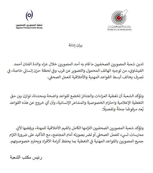 تدين شعبة المصورين الصحفيين ما قام به أحد المصورين خلال عزاء والدة الفنان أحمد الفيشاوي، من توجيه الهاتف المحمول والتصوير عن قرب وفي لحظة حزن إنساني خاصة، في تصرف يخالف أبسط القواعد المهنية والأخلاقية للعمل الصحفي.