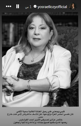 أضافت "اللوزي" عبر حسابها الشخصي على موقع تبادل الصور والفيديوهات "إنستجرام"، كلمات مؤثرة معبّرة عن محبّتها الكبيرة للراحلة، قائلة: "قلبي وجعني على رحيل الفنانة الغالية سمية الألفي، كان نفسي أحضر العزاء وأودعها، لكن للأسف مقدرتش لأني كنت خارج مصر".