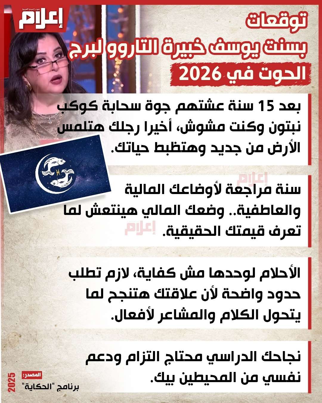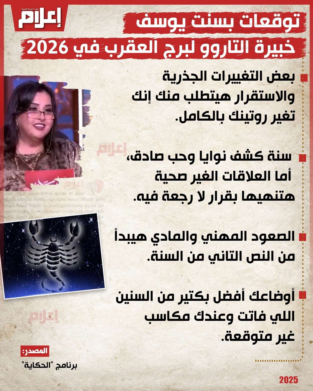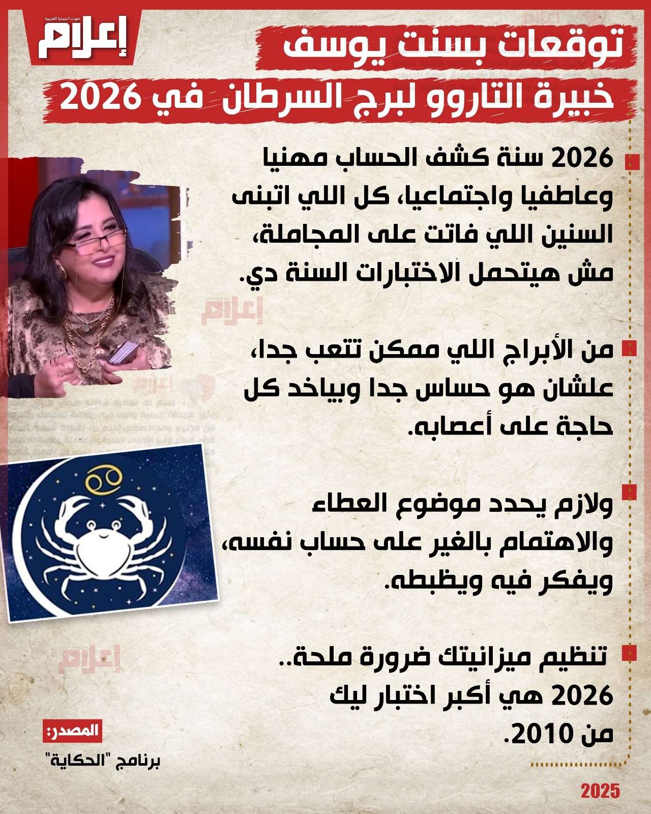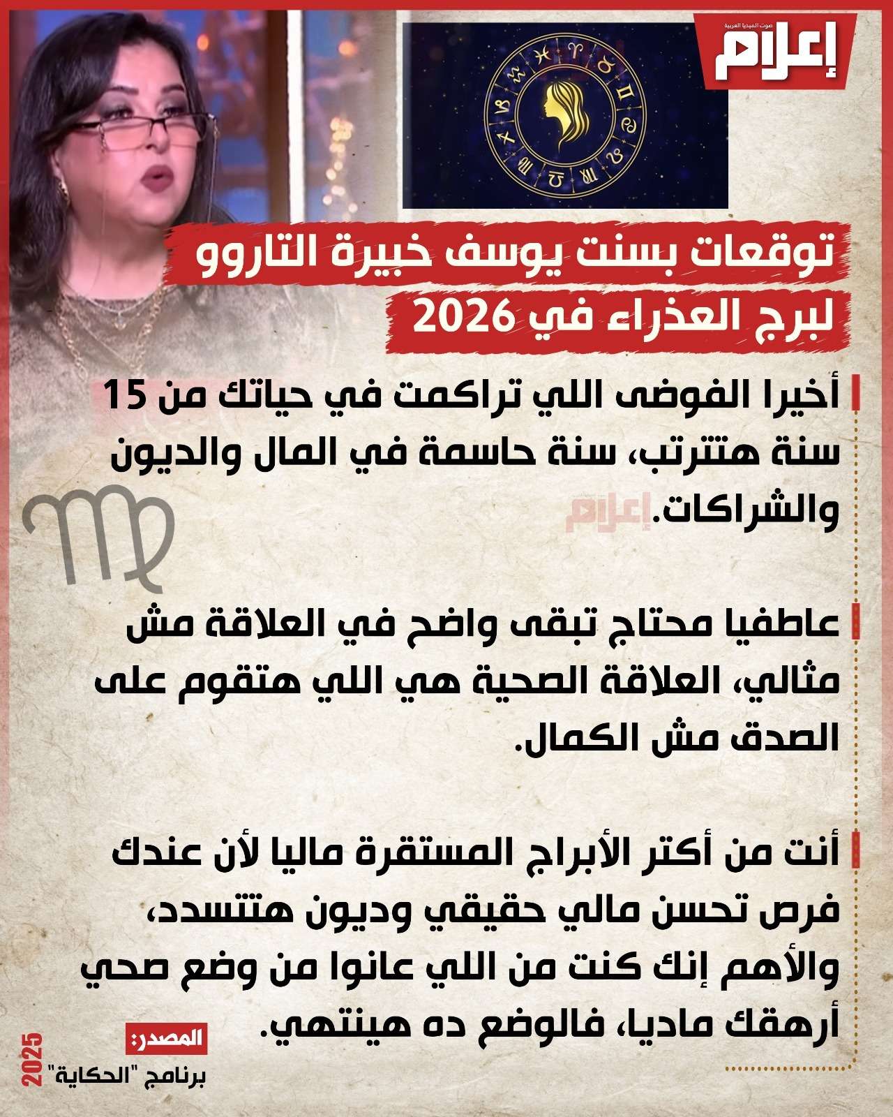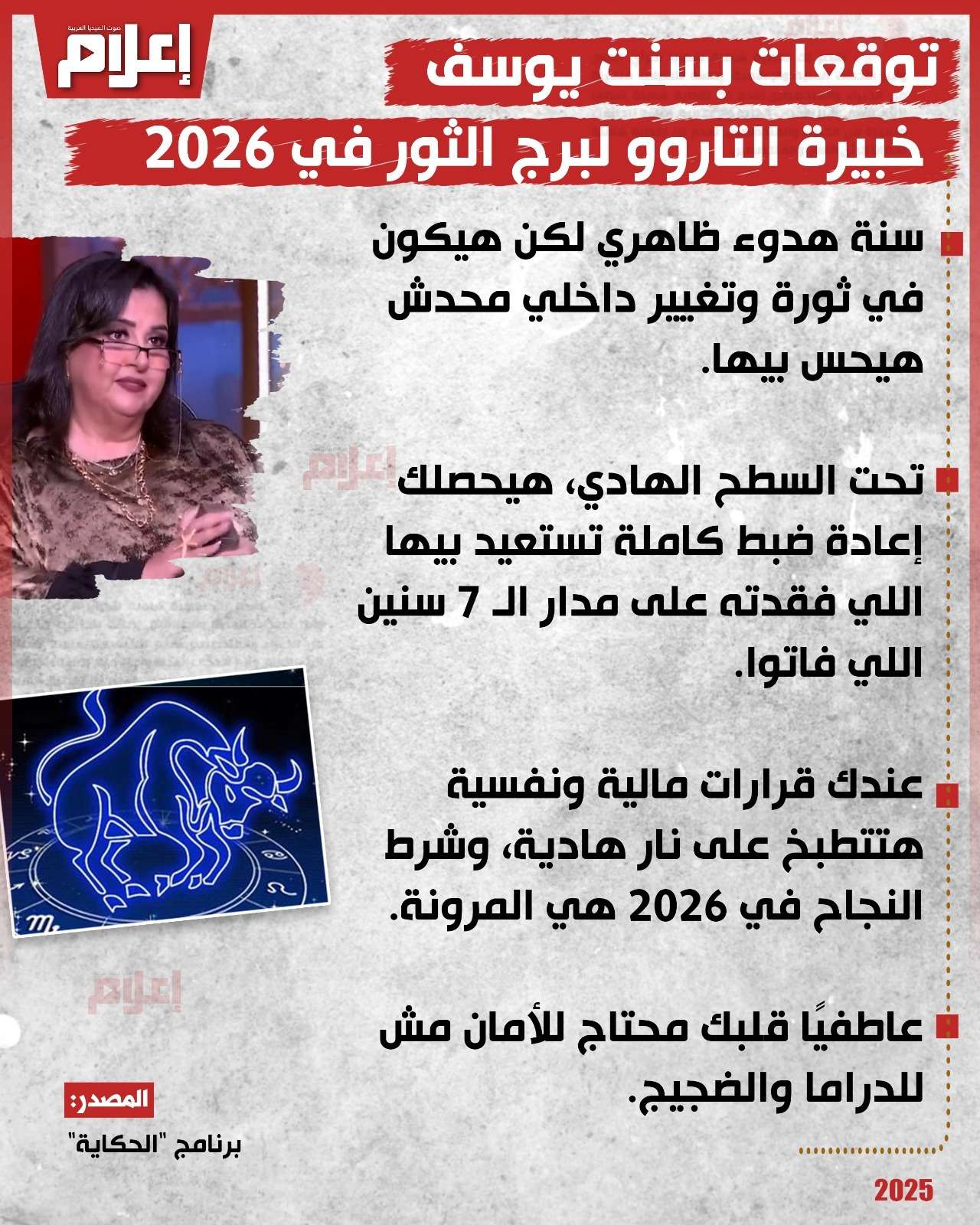 حلت بسنت يوسف خبيرة التاروو ضيفة على برنامج "الحكاية" المذاع على شاشة mbc مصر، ويقدمه الإعلامي عمرو أديب، وكشفت عن توقعاتها للأبراج في عام 2026.