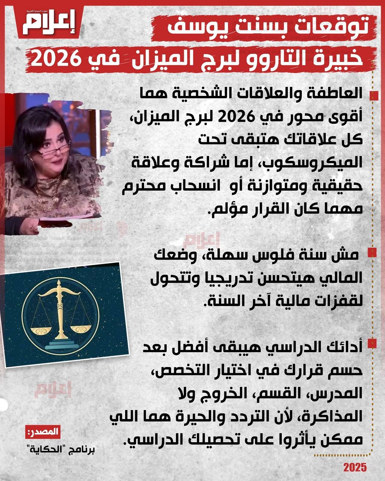 العاطفة والعلاقات الشخصية هما أقوى محور في 2026 لبرج الميزان، كل علاقاتك هتبقى تحت الميكروسكوب، إما شراكة وعلاقة حقيقية ومتوازنة أو انسحاب محترم مهما كان القرار مؤلم.