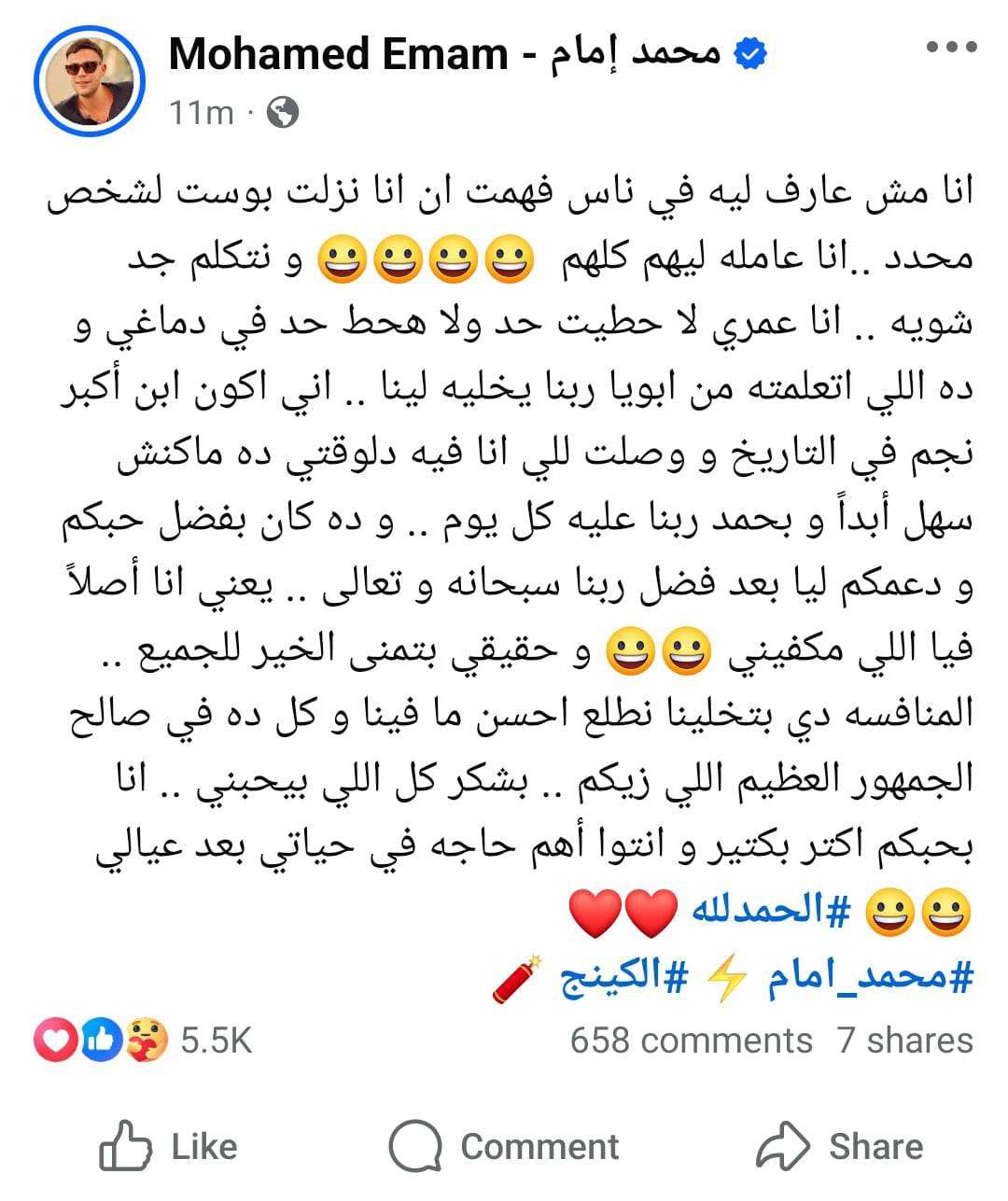 كتب "إمام" عبر حسابه الرسمي على موقع التواصل الاجتماعي "فيس بوك": "أنا مش عارف ليه في ناس فهمت إن أنا نزلت بوست لشخص محدد، أنا عامله ليهم كلهم".