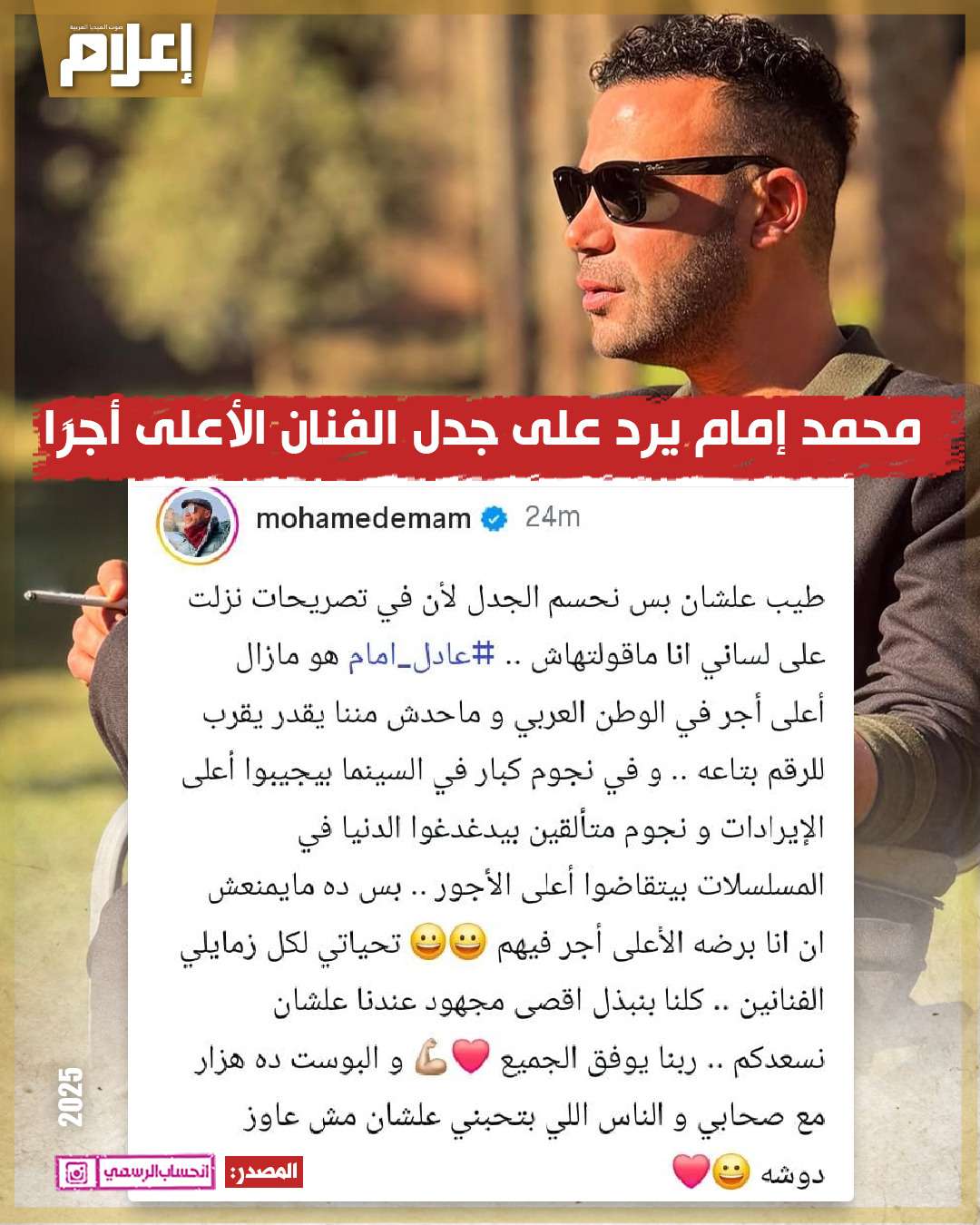 وكان قد كتب الفنان محمد إمام عبر حسابه الرسمي على موقع التواصل الاجتماعي وتبادل الصور والفيديوهات "إنستجرام": "طيب علشان بس نحسم الجدل لأن في تصريحات نزلت على لساني أنا ماقولتهاش.. عادل إمام هو ما زال أعلى أجر في الوطن العربي ومحدش مننا يقدر يقرب للرقم بتاعه.".