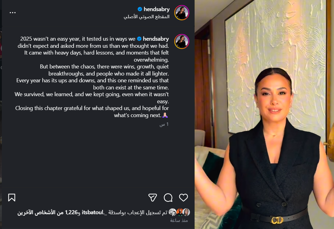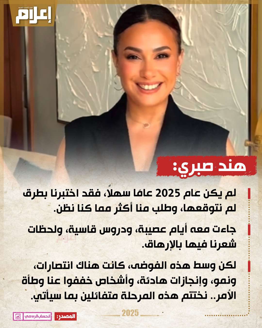 ونشرت "صبري" عبر حسابها الرسمي على موقع "إنستجرام" مقطع فيديو لها وعلقت عليه: "لم يكن عام ٢٠٢٥ عامًا سهلاً، فقد اختبرنا بطرق لم نتوقعها، وطلب منا أكثر مما كنا نظن.. جاءت معه أيام عصيبة، ودروس قاسية، ولحظات شعرنا فيها بالإرهاق".