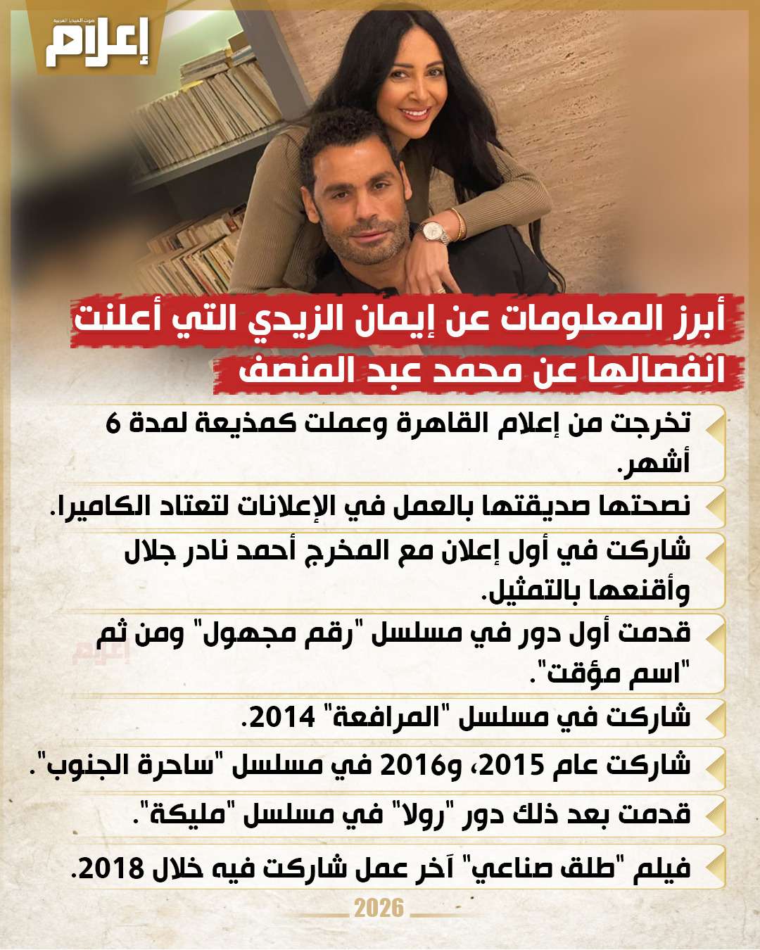 ونشرت "الزيدي" عبر حسابها الشخصي على موقع "إنستجرام"، صورة جمعتها بـ "عبد المنصف"، وعلقت عليها كاتبة: "أعلن انفصالي عن زوجي محمد عبد المنصف بعد زواج شرعي دام 7 سنوات".