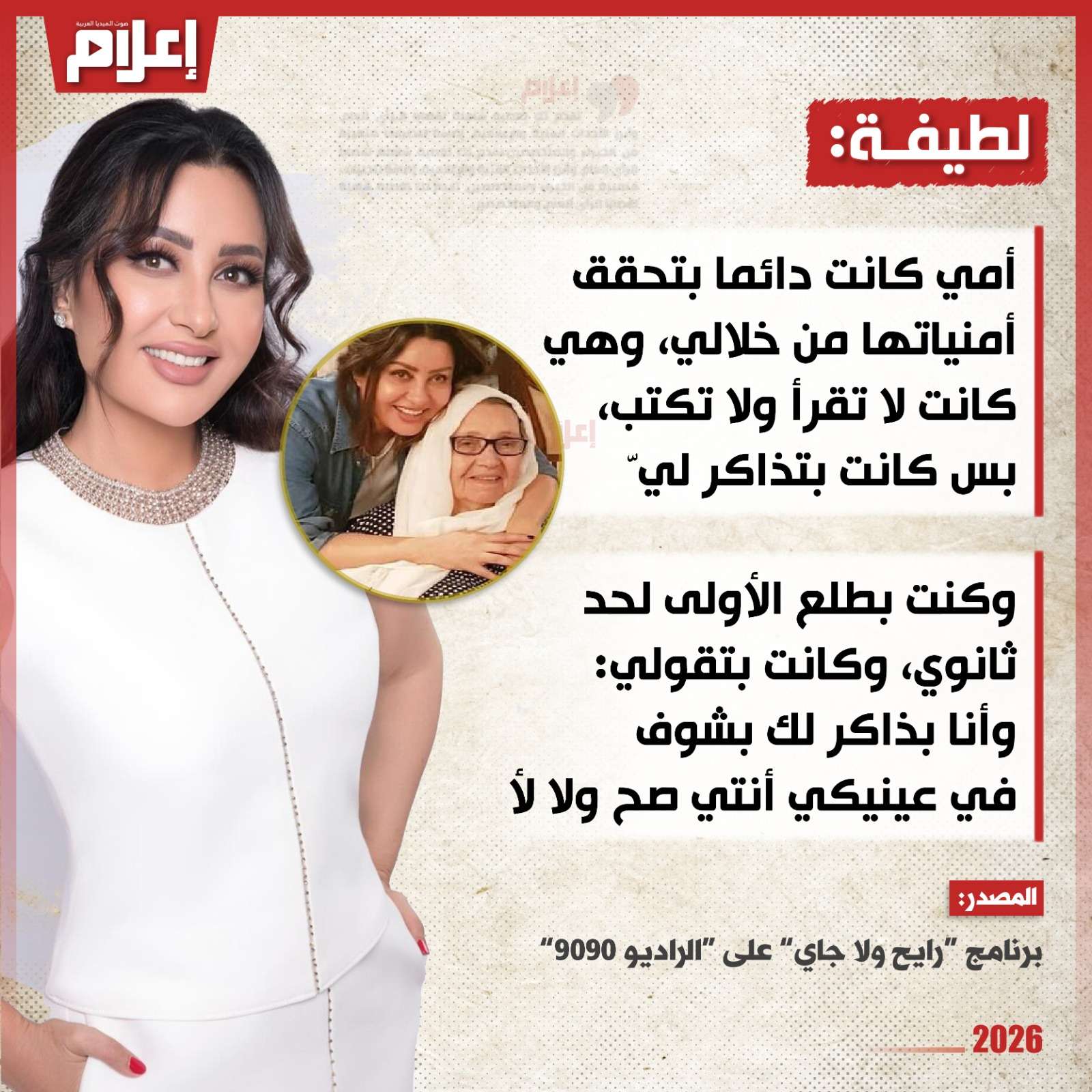 قالت "لطيفة" خلال استضافتها في برنامج "رايح ولا جاي" المذاع عبر إذاعة "الراديو 9090": "أمي كانت دائما بتحقق أمنياتها من خلالي، وهي كانت لا تقرأ ولا تكتب، بس كانت بتذاكر لي، وكنت بطلع الأولى لحد ثانوي، وكانت بتقولي: أنا كنت بذاكر لكم وبشوف في عينيكي أنتي صح ولا لأ".