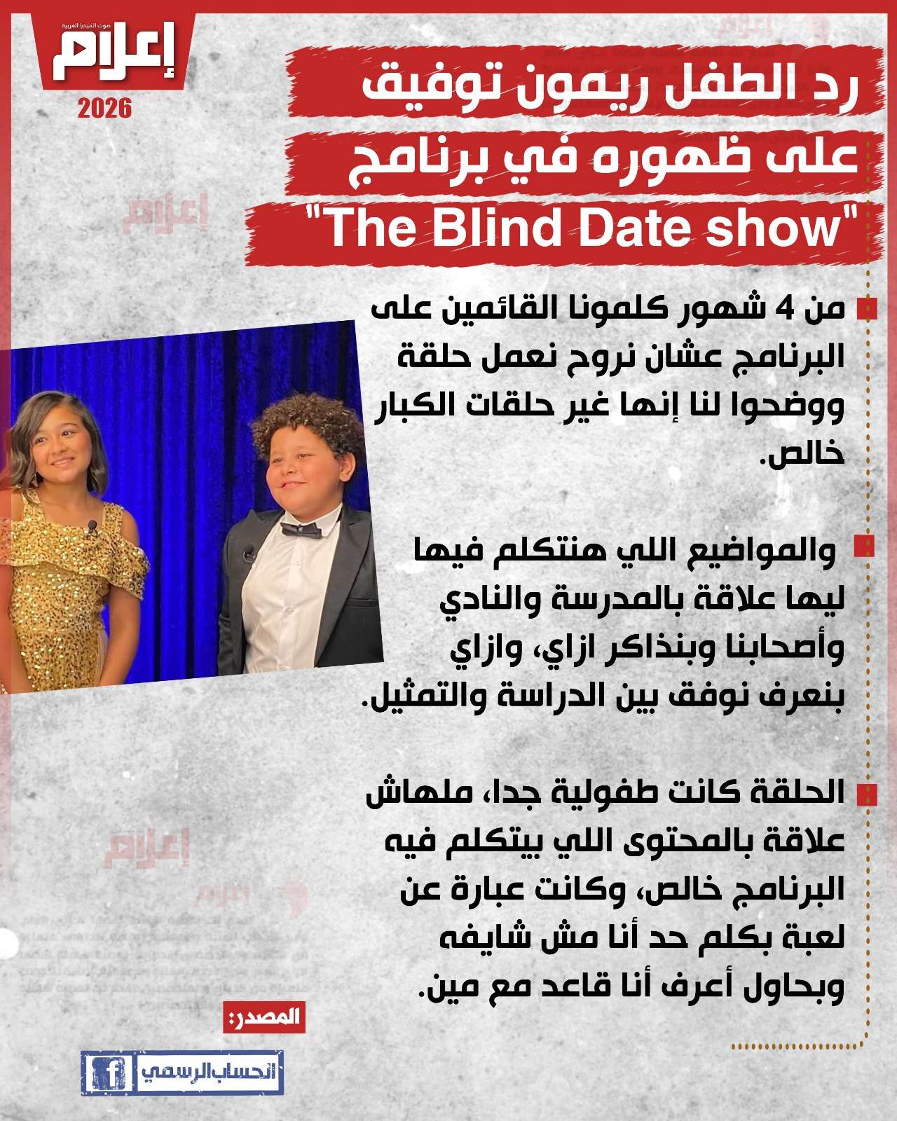 رد الطفل ريمون توفيق على الجدل المثار حول حلقته في برنامج "The Blind Date show"، والتي تم حذفها بسبب هجوم الجمهور.
