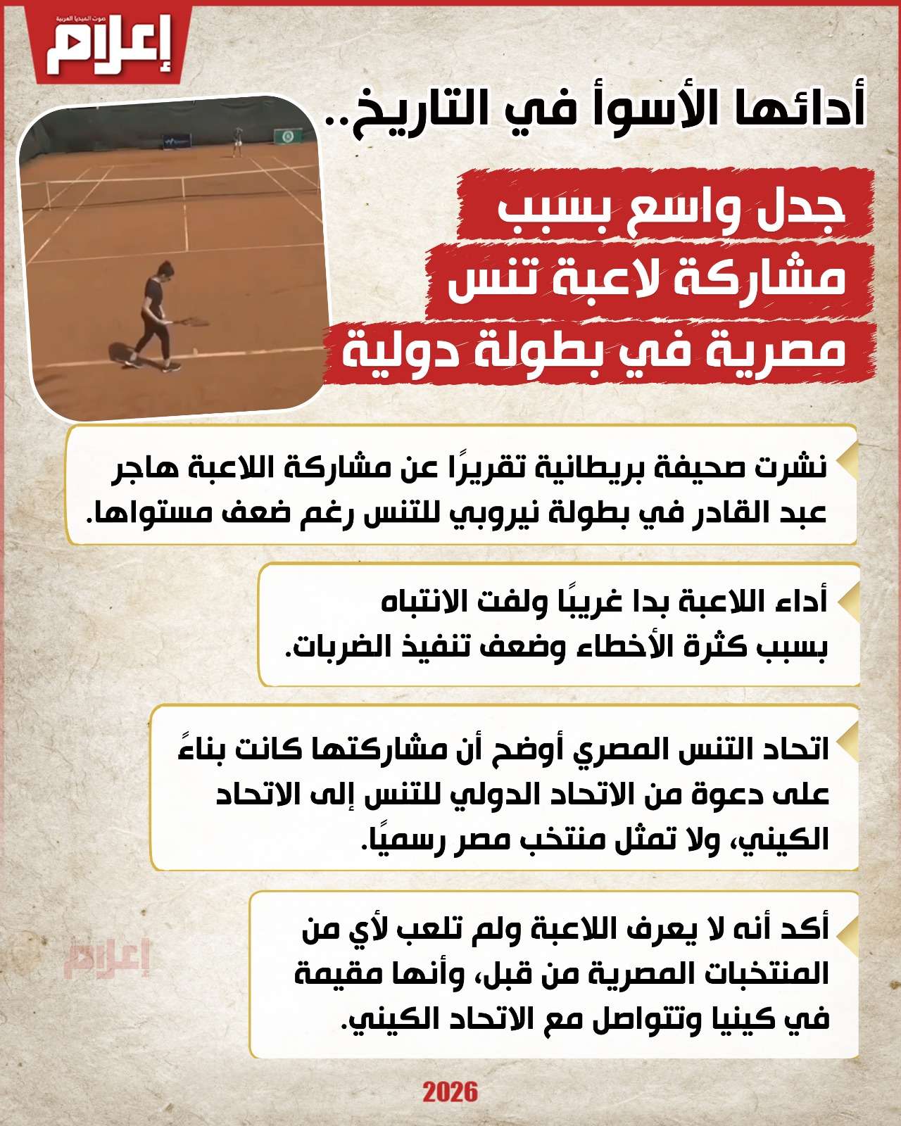 أثارت اللاعبة المصرية هاجر عبد القادر جدلا واسعا بعد مشاركتها في بطولة الاتحاد الدولي للتنس للسيدات «ITF W35» المقامة في نيروبي، كينيا، حيث خسرت مباراتها في الدور الأول أمام الألمانية لورينا شيدل بنتيجة 6-0 و6-0 في 37 دقيقة فقط، ولم تحقق سوى ثلاث نقاط فقط.
