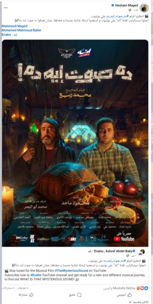 من المقرر طرح الفيلم قريبا على قناة "إنه" على موقع الفيديوهات يوتيوب، الفيلم بطولة أشرف عبد الباقي ومحمود ماجد، ومن المقرر أن يضم تجربة غنائية مختلفة.