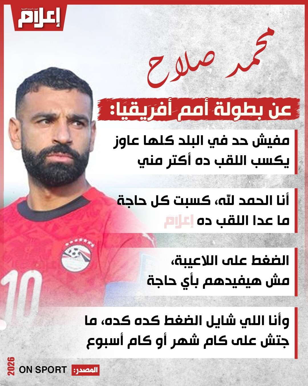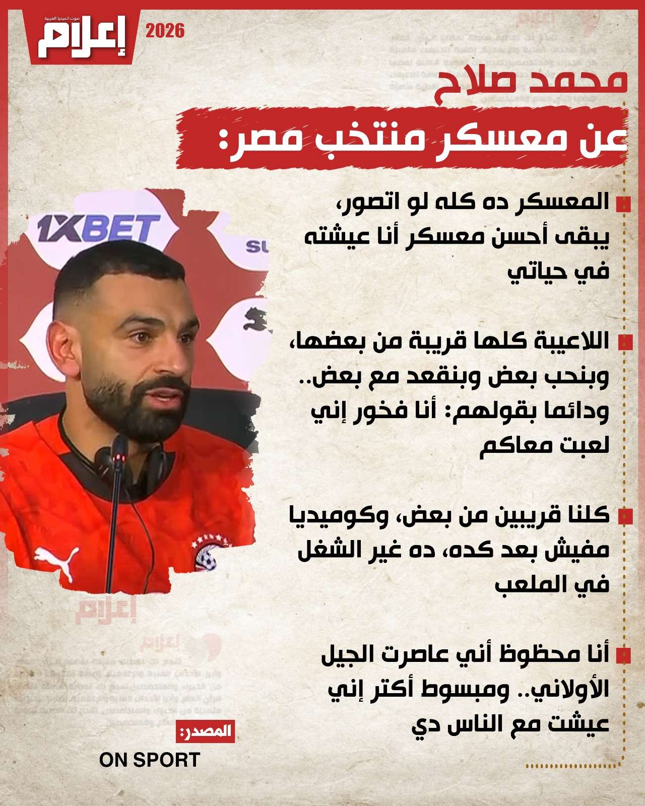 قال "صلاح" خلال المؤتمر الصحفي للمنتخب الوطني بعد التأهل لنصف أمم أفريقيا، المذاع عبر " ON SPORT": "المعسكر ده كله لو اتصور، يبقى أحسن معسكر أنا عيشته في حياتي، اللاعيبة كلها قريبة من بعضها، وبنحب بعض وبنقعد مع بعض، كلنا قريبين من بعض، وكوميديا مفيش بعد كده، غير الشغل في الملعب وبره الملعب".