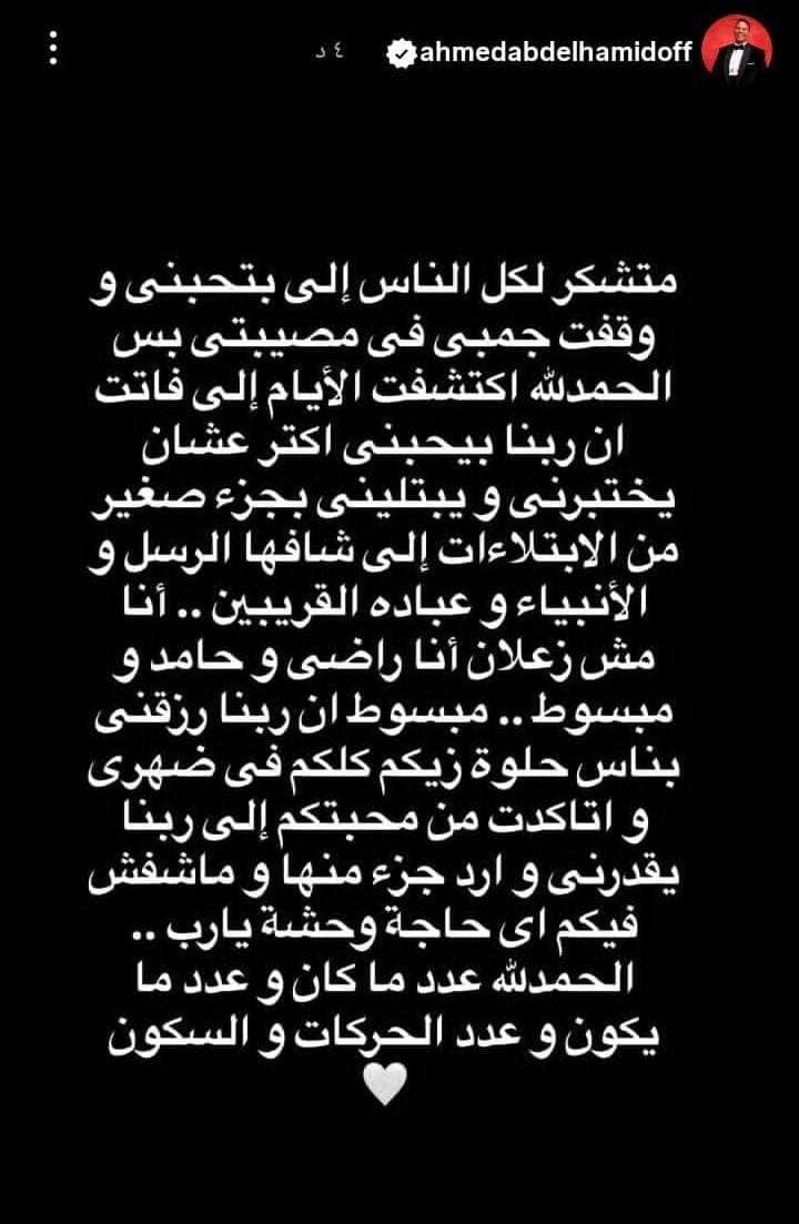 قال أحمد عبد الحميد، عبر خاصية القصص المصورة بموقع الصور والفيديوهات "إنستجرام": "متشكر لكل الناس اللي بتحبني ووقفت جنبي في مصيبتي، الحمد لله اكتشفت الأيام اللي فاتت إن ربنا بيحبني أكتر عشان يختبرني ويبتليني بجزء صغير من الابتلاءات اللي شافها الرسل والأنبياء وعباده القريبين".