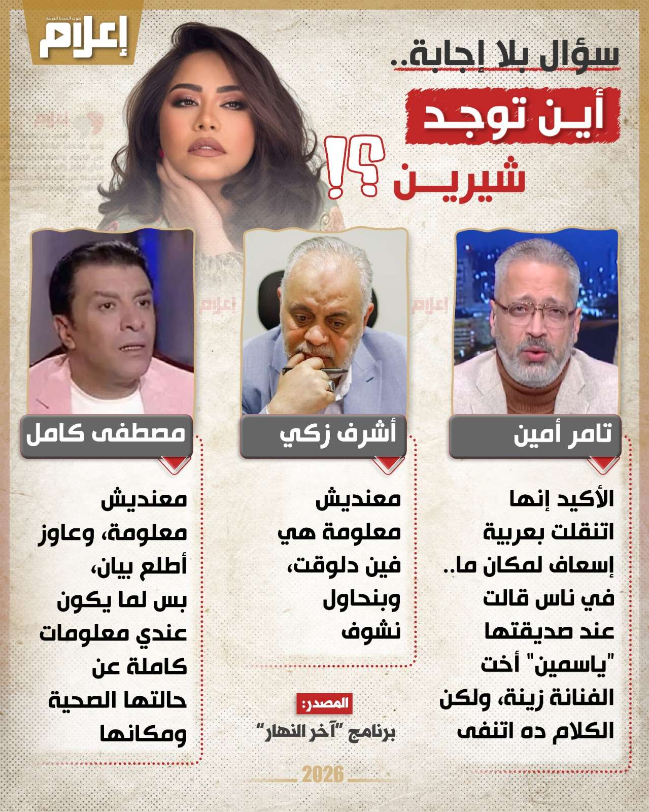 كل هذه الأخبار والشائعات تتداول بكثرة على مواقع التواصل الاجتماعي، وسط صمت تام من أسرة شيرين، وتساؤلات جمهورها ومحبيها: "أين شيرين الآن؟"