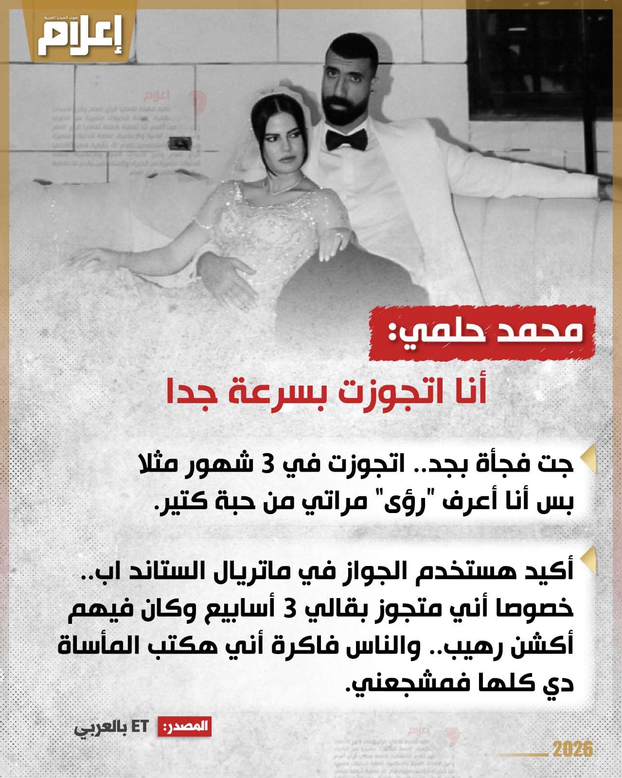 تحدث الستاند اب كوميديان محمد حلمي عن زواجه الذي تم بشكلٍ سريع خلال 3 أشهر فقط، مشيرًا إلى أنه سيستخدم تجربته مع الزواج في المحتوى الذي يقدمه.