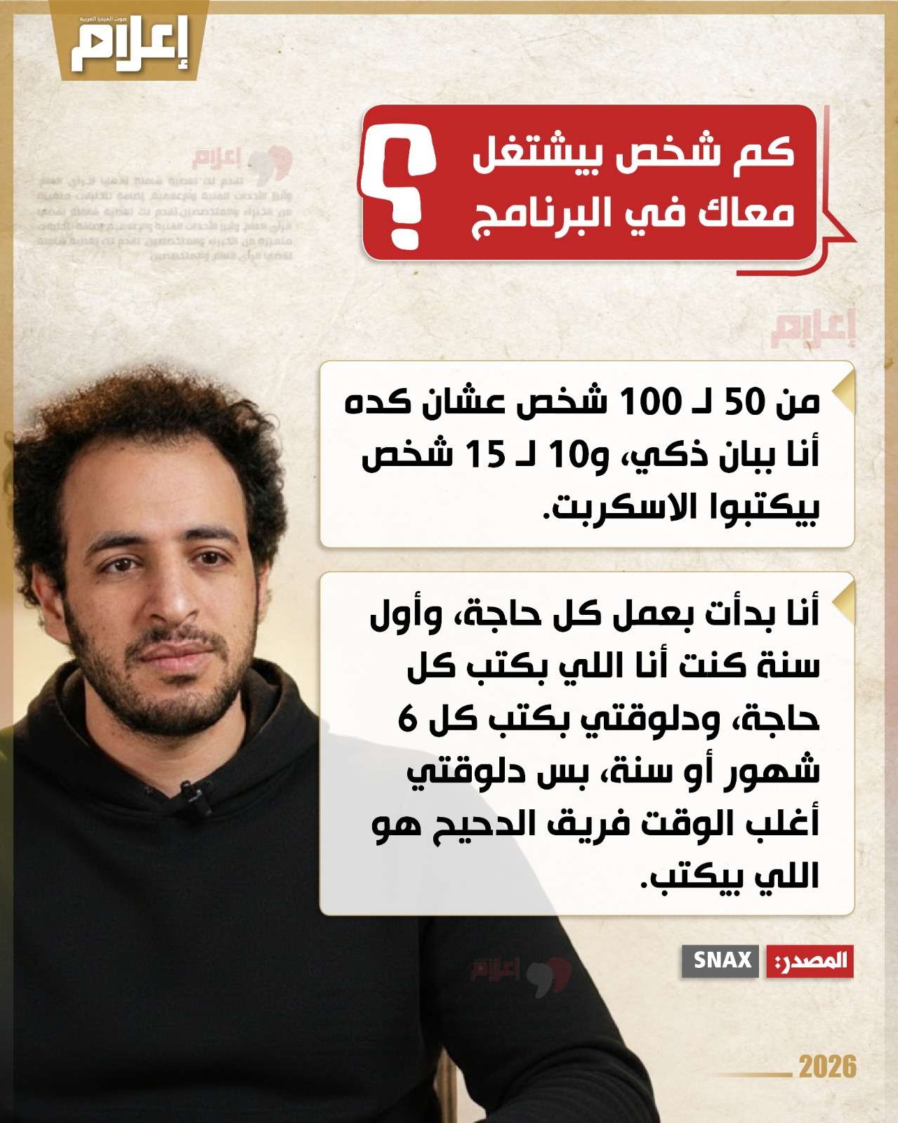 أوضح أن فريق عمل برنامجه يضم حوالي من 50 إلى 100 شخص، فيما يتم كتابة سكربت الحلقة من قِبل 10 إلى 15 شخص، معلقا: "عشان كده أنا ببان ذكي".