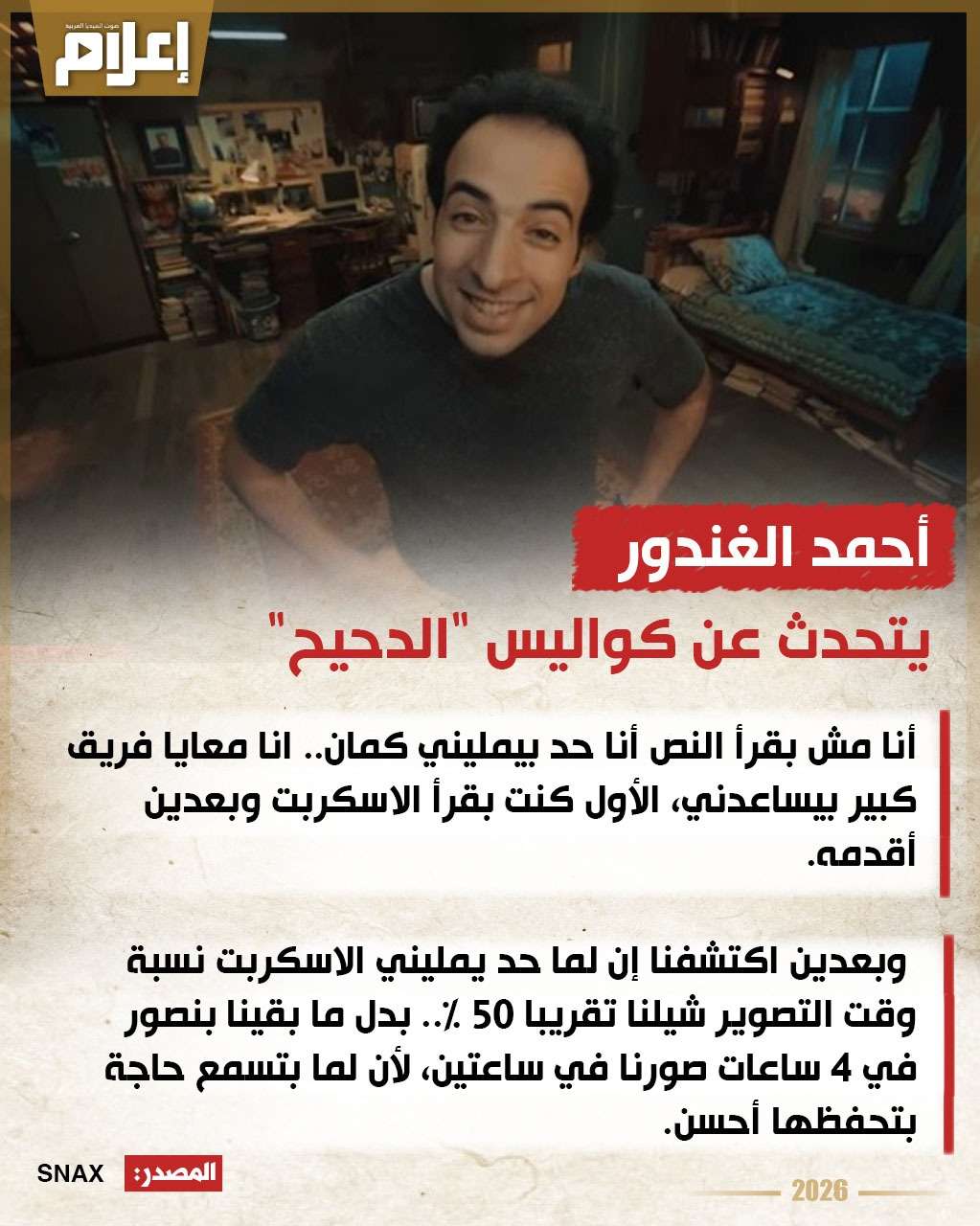 تابع: "وبعدين اكتشفنا إن لما حد يمليني الاسكربت نسبة وقت التصوير شيلنا تقريبا 50%.. بدل ما بقينا بنصور في 4 ساعات صورنا في ساعتين، لأن لما بتسمع حاجة بتحفظها أحسن".