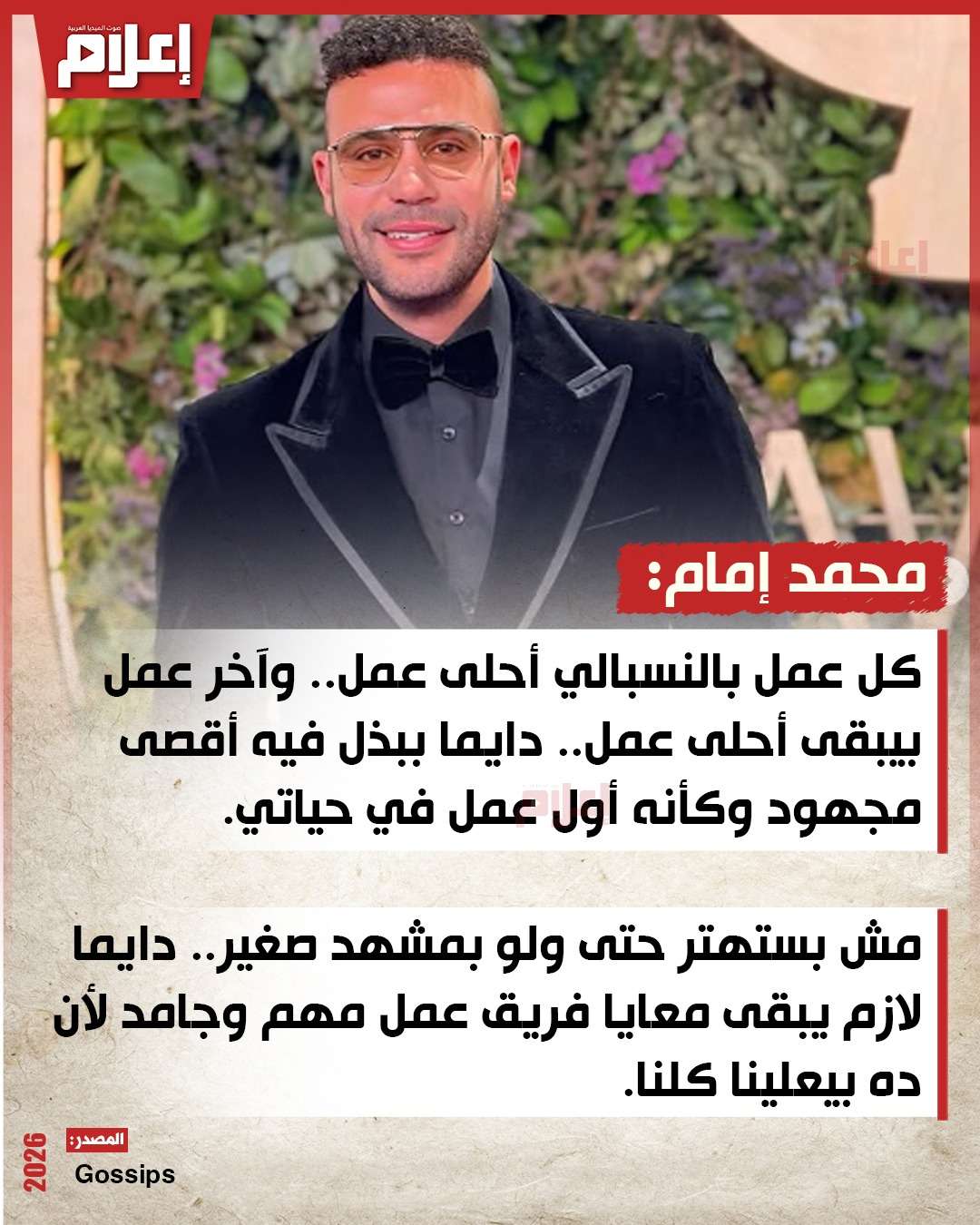 قال "إمام" خلال لقائه عبر "Gossips": "كل عمل بالنسبالي أحلى عمل.. وآخر عمل بيبقى أحلى عمل.. دايما ببذل فيه أقصى مجهود وكأنه أول عمل في حياتي".