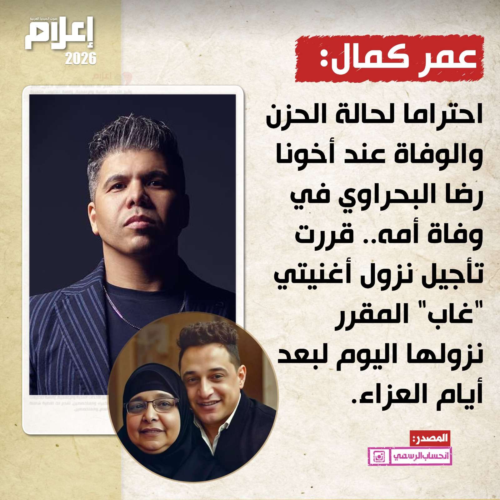 كتب "عمر" عبر حسابه الشخصي على موقع "إنستجرام": "احتراما لحالة الحزن والوفاة عند أخونا رضا البحراوي في وفاة أمه.. قررت تأجيل نزول أغنيتي "غاب" المقرر نزولها اليوم لبعد أيام العزاء".