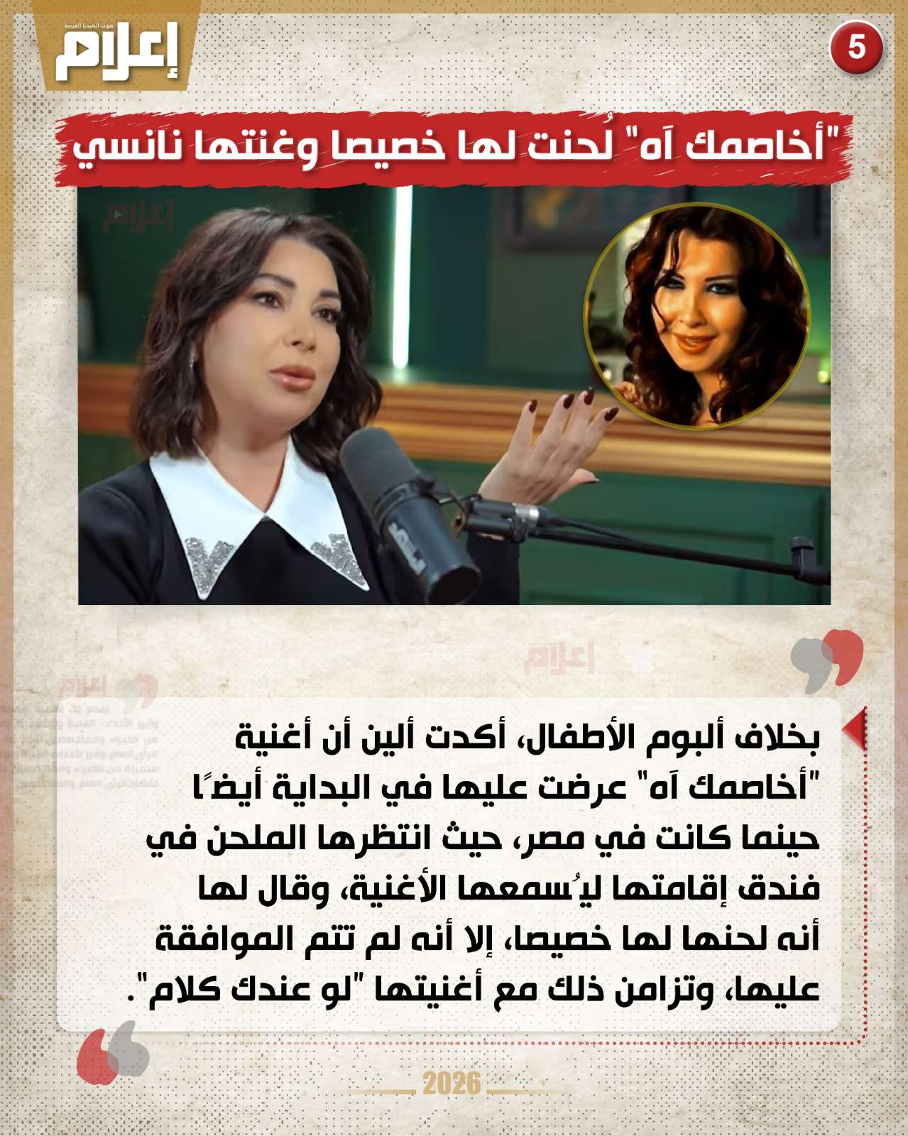 وبخلاف ألبوم الأطفال، أكدت ألين أن أغنية "أخاصمك آه" عرضت عليها في البداية أيضًا حينما كانت في مصر، حيث انتظرها الملحن في فندق إقامتها ليُسمعها الأغنية، وقال لها أنه لحنها لها خصيصا، إلا أنه لم تتم الموافقة عليها، وتزامن ذلك مع أغنيتها "لو عندك كلام".