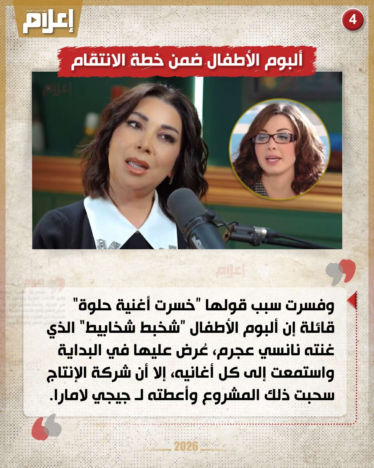وفسرت سبب قولها "خسرت أغنية حلوة" قائلة إن ألبوم الأطفال "شخبط شخابيط" الذي غنته نانسي عجرم، عُرض عليها في البداية واستمعت إلى كل أغانيه، إلا أن شركة الإنتاج سحبت ذلك المشروع وأعطته لـ جيجي لامارا.