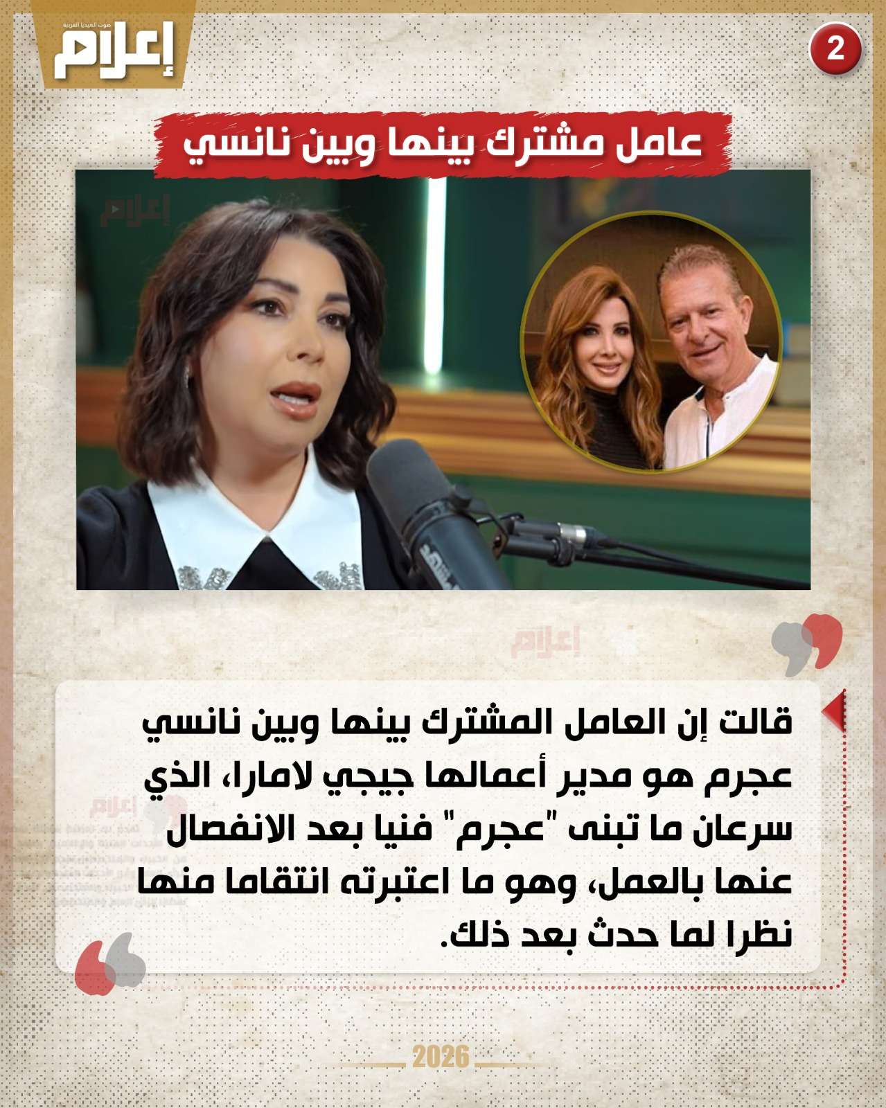أوضحت "خلف" في لقاء لها مع محمد قيس خلال بودكاست "عندي سؤال" عبر قناة المشهد، أن العامل المشترك بينها وبين نانسي عجرم هو مدير أعمالها جيجي لامارا، الذي سرعان ما تبنى "عجرم" فنيا بعد الانفصال عنها بالعمل، وهو ما اعتبرته انتقاما منها نظرا لما حدث بعد ذلك.
