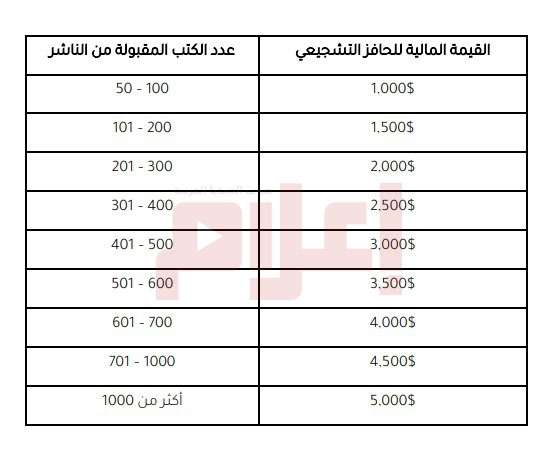 علاوةً على تقديم حافز مادي لتشجيع الناشرين العرب على الاشتراك في المباردة وفقًا للجدول التالي: