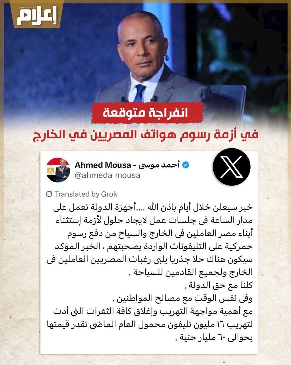 ذكر "موسى" في تدوينة عبر حسابه على موقع التدوينات القصيرة "إكس": "خبر سيُعلن خلال أيام بإذن الله، أجهزة الدولة تعمل على مدار الساعة في جلسات عمل لإيجاد حلول لأزمة استثناء أبناء مصر العاملين في الخارج والسياح من دفع رسوم جمركية على التليفونات الواردة بصحبتهم، والخبر المؤكد سيكون هناك حلًّا جذريًا يُلبي رغبات المصريين العاملين في الخارج ولجميع القادمين للسياحة".