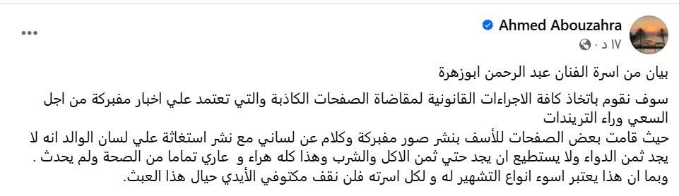 أعلنت أسرة الفنان الكبير عبد الرحمن أبو زهرة عزمها اتخاذ كافة الإجراءات القانونية ضد عدد من الصفحات التي نشرت أخبارًا وصفتها بالكاذبة والمفبركة، سعيًا وراء تحقيق التفاعل والتريندات.