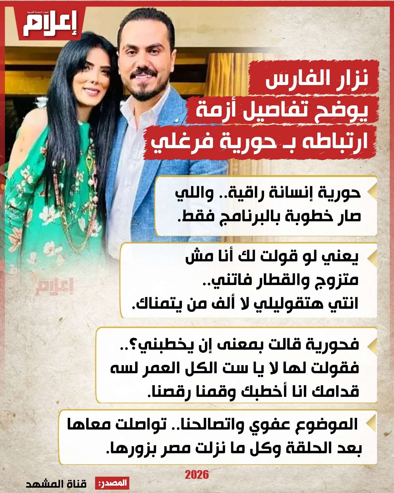روى الإعلامي العراقي نزار الفارس، تفاصيل الأزمة التي حدثت بينه وبين الفنانة حورية فرغلي، عقب استضافتها في إحدى حلقات برنامجه وتداول أنباء بشأن خطوبتهما.