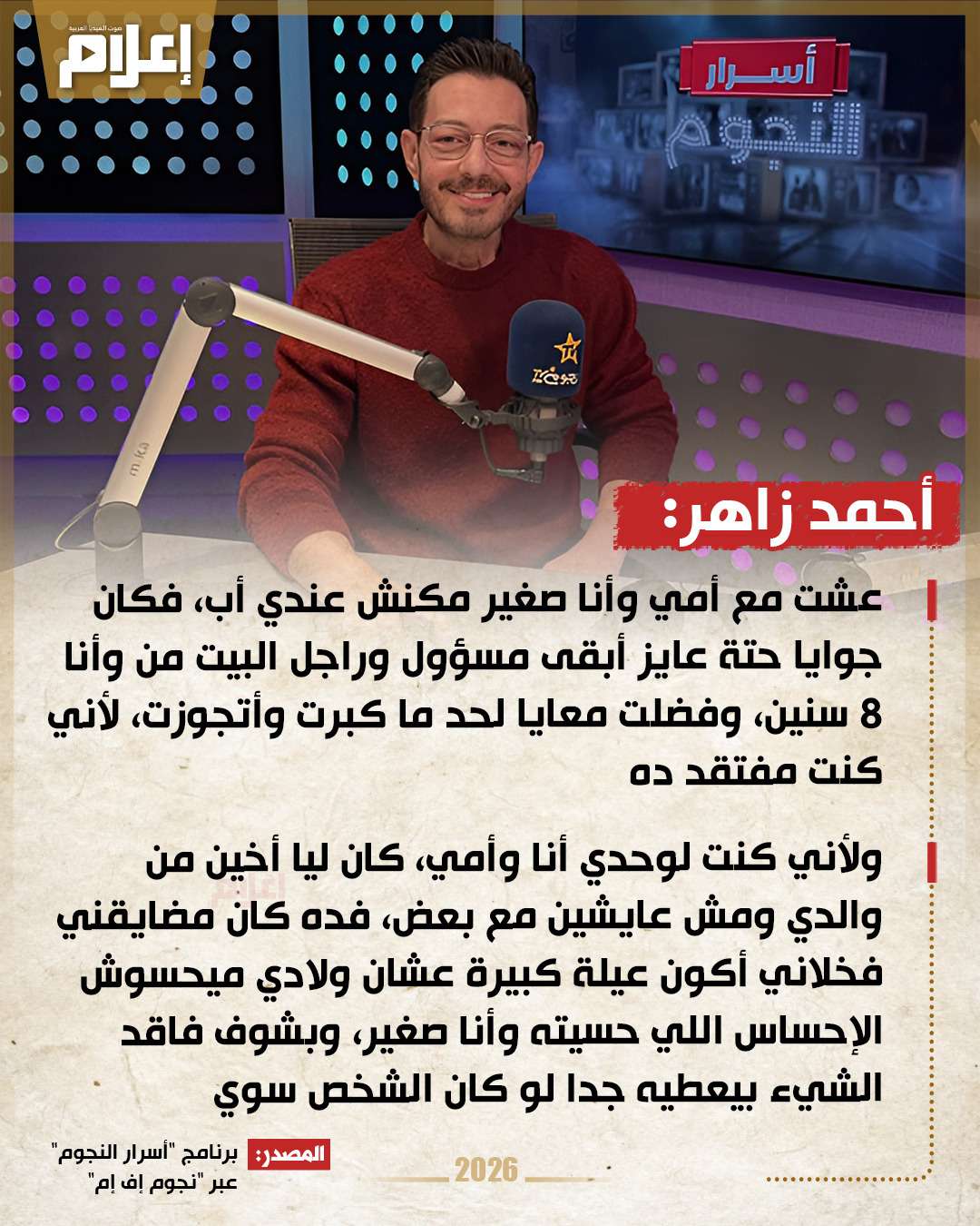 تحدث الفنان أحمد زاهر عن تفاصيل مؤثرة من طفولته، وكيف أثرت في تكوينه وشخصيته، مؤكدًا أنه نشأ مع والدته فقط دون وجود والده في حياته، وهو ما ترك بداخله شعورًا مبكرًا بالمسؤولية منذ صغره.