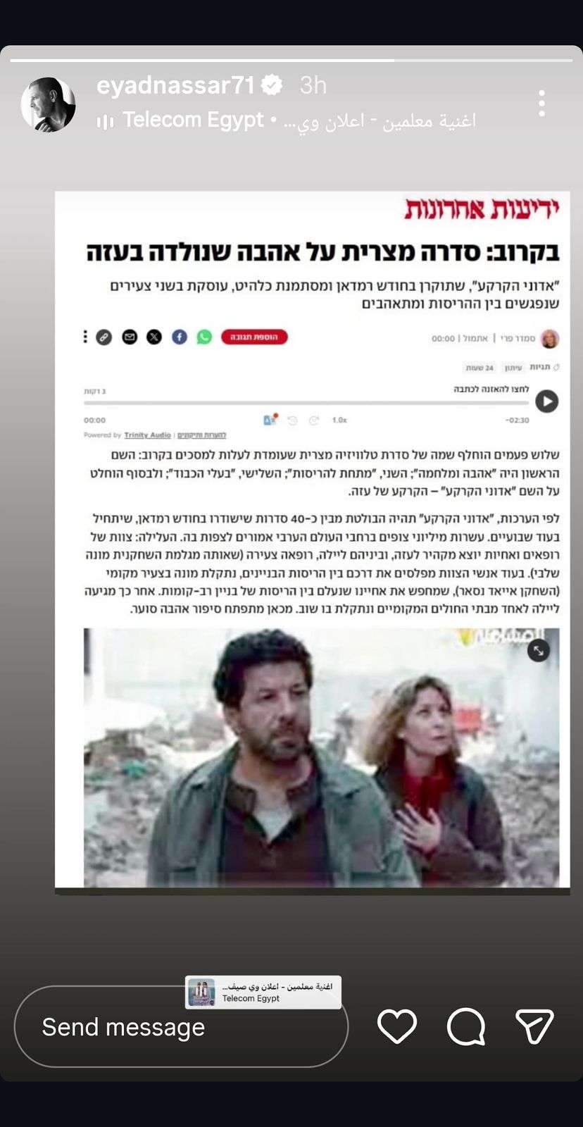 ذلك وفق ما نُشر في صحفية "يديعوت أحرونوت" التي كتبت عددًا من الأسماء غير الصحيحة للعمل، مستخفين بقيمة العمل والهدف الأساسي منه، وإظهاره بأنه مجرد قصة حب تجمع بين بطلي العمل، دون أي تعليق على الهدف الأساسي من العمل وهو إظهار مدى المعاناة التي مر بها الشعب الفلسطيني تحت ظروف الحصار والحرب التي أبادت الكثير من البشر هناك، محاولين الإشارة للتقليل من نجوم العمل والمشاركين فيه من الممثلين الفلسطينين، ومحاولين كعادتهم تقديم مغالطات على أن العمل يلقى ردود فعل سلبية في محاولة للتأثير على آراء الجمهور، خاصة بعد الدعم الذي تلاقاه النجم إياد نصار وكل نجوم العمل وشركة الإنتاج عن جرأة الطرح.