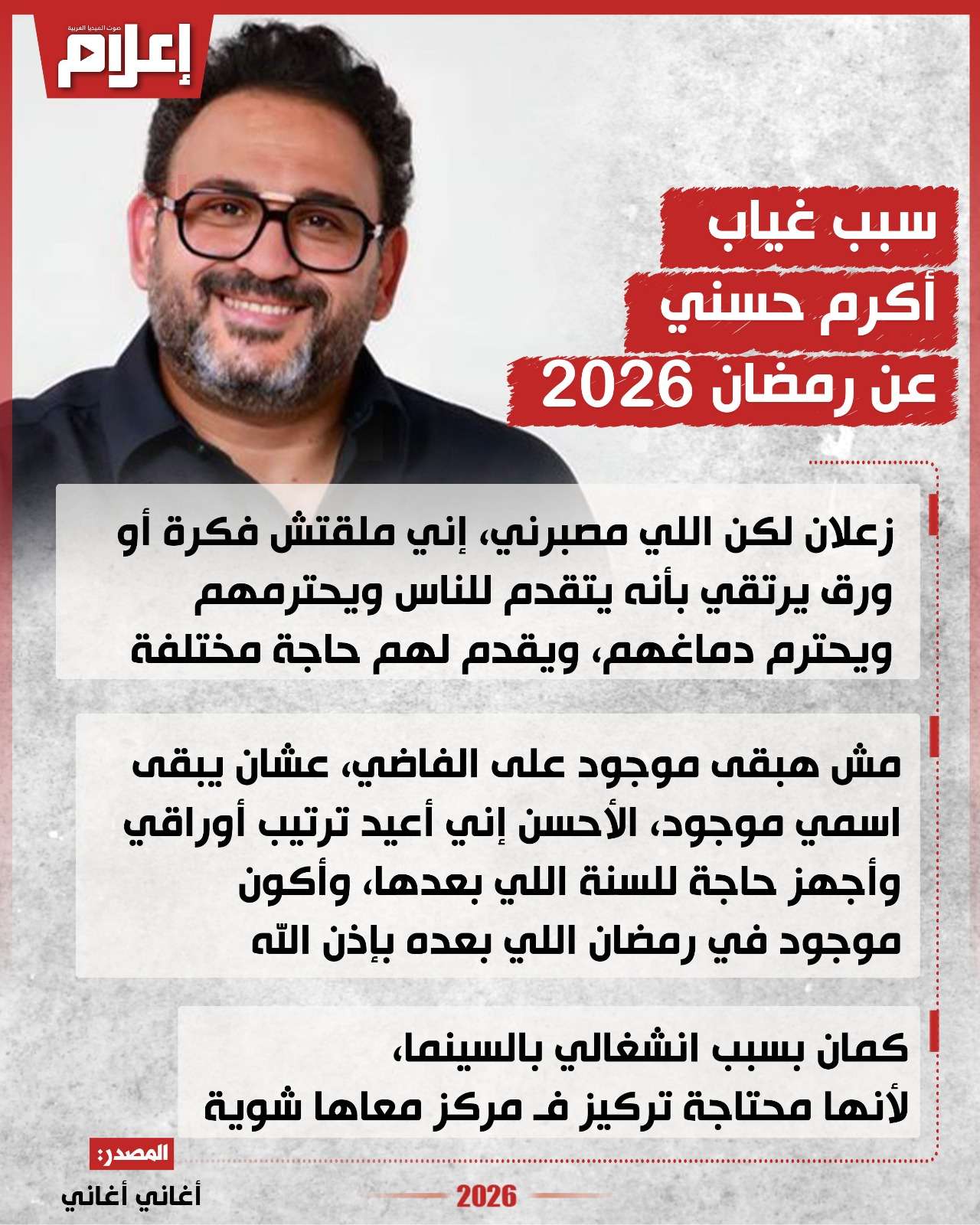 أضاف أنه يرفض الظهور لمجرد التواجد، قائلًا: "مش هبقى موجود على الفاضي عشان يبقى اسمي موجود، الأحسن إني أعيد ترتيب أوراقي وأجهز حاجة للسنة اللي بعدها، وأكون موجود في رمضان اللي بعده بإذن الله".