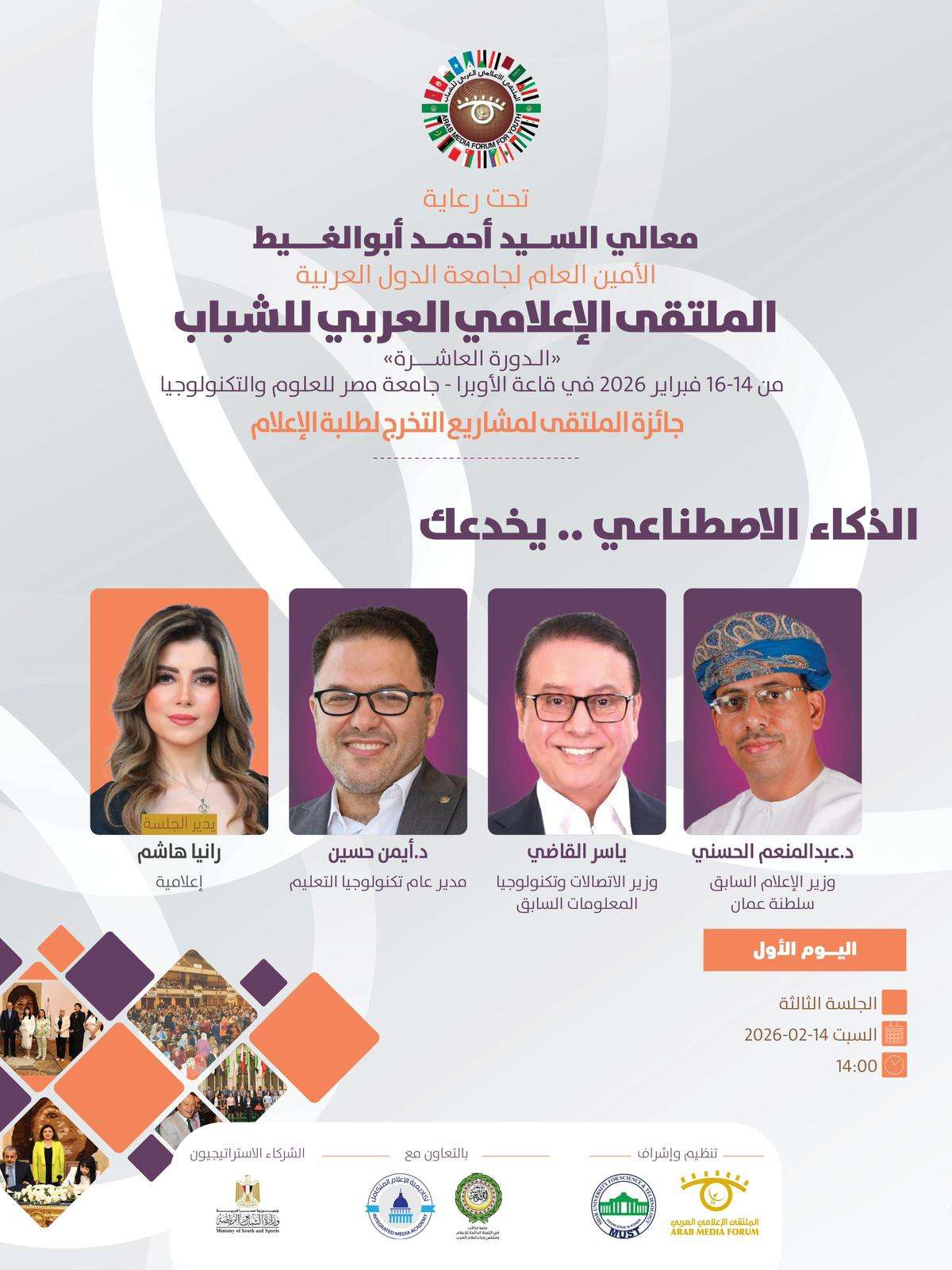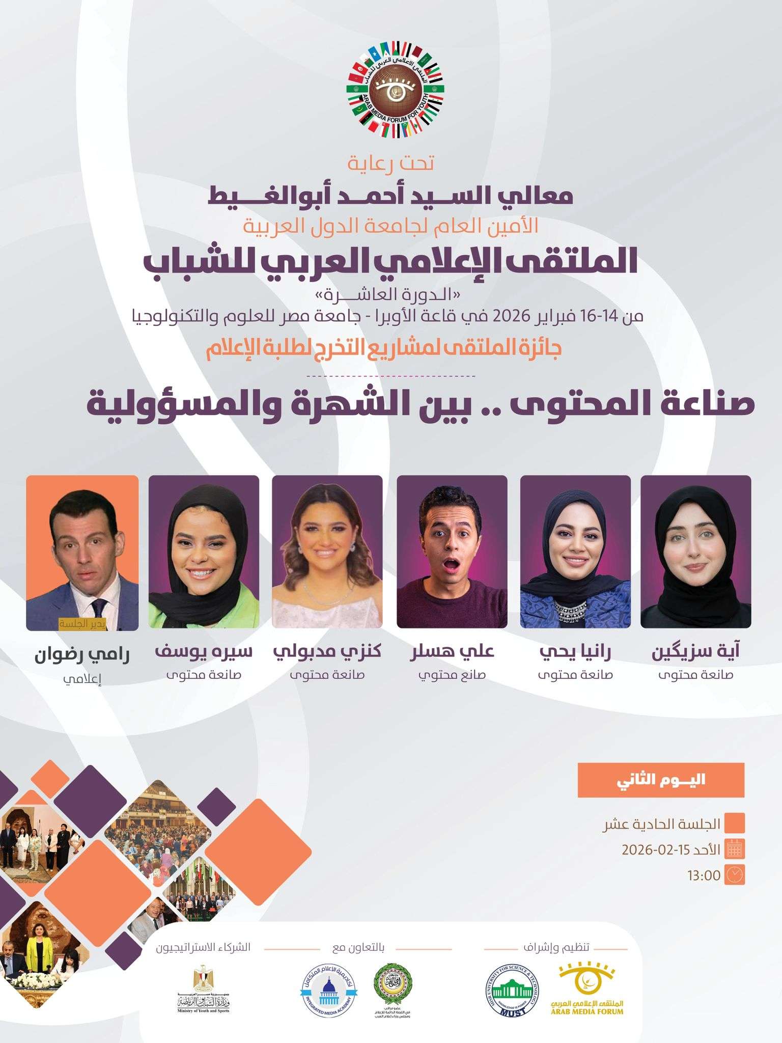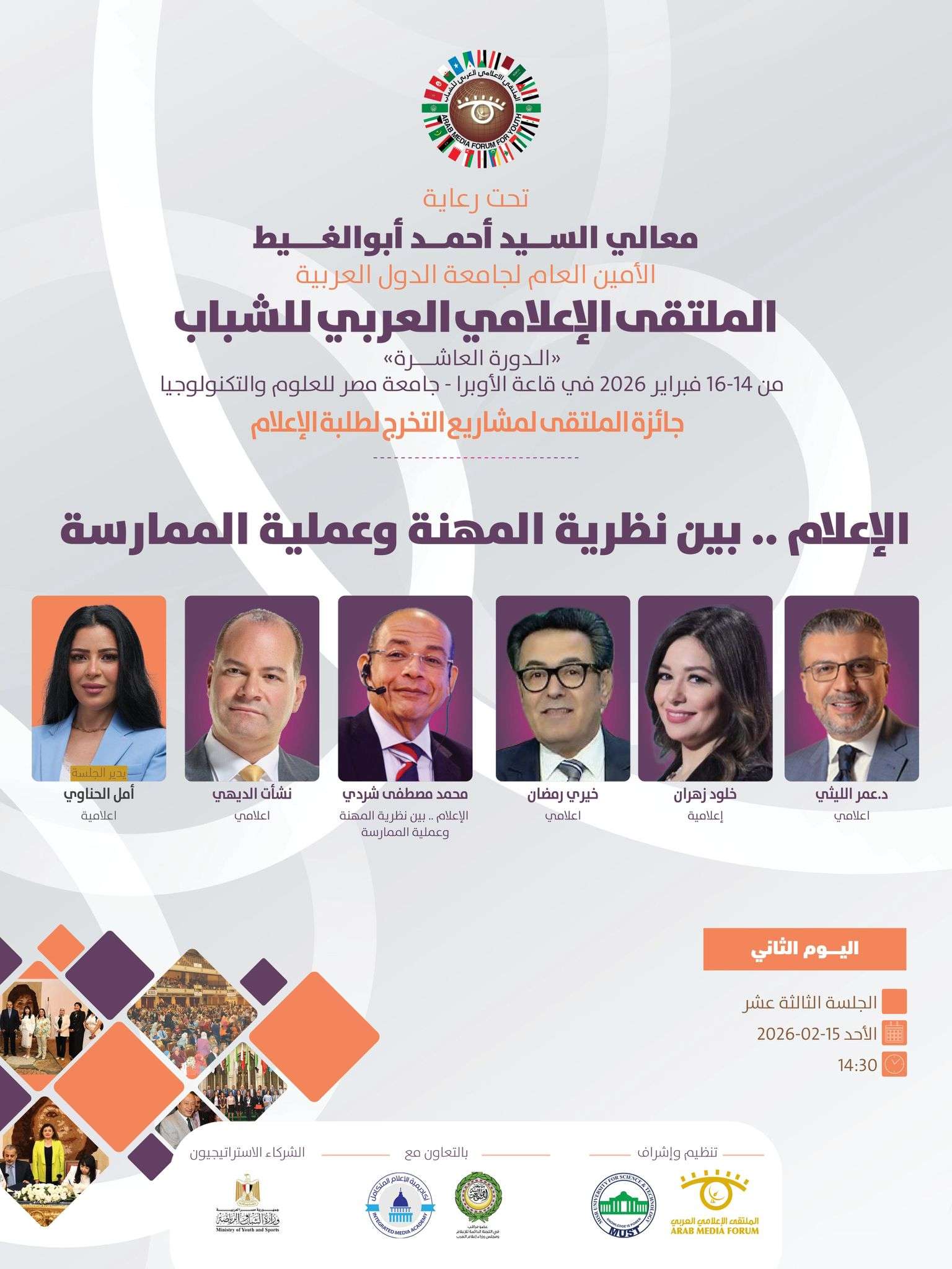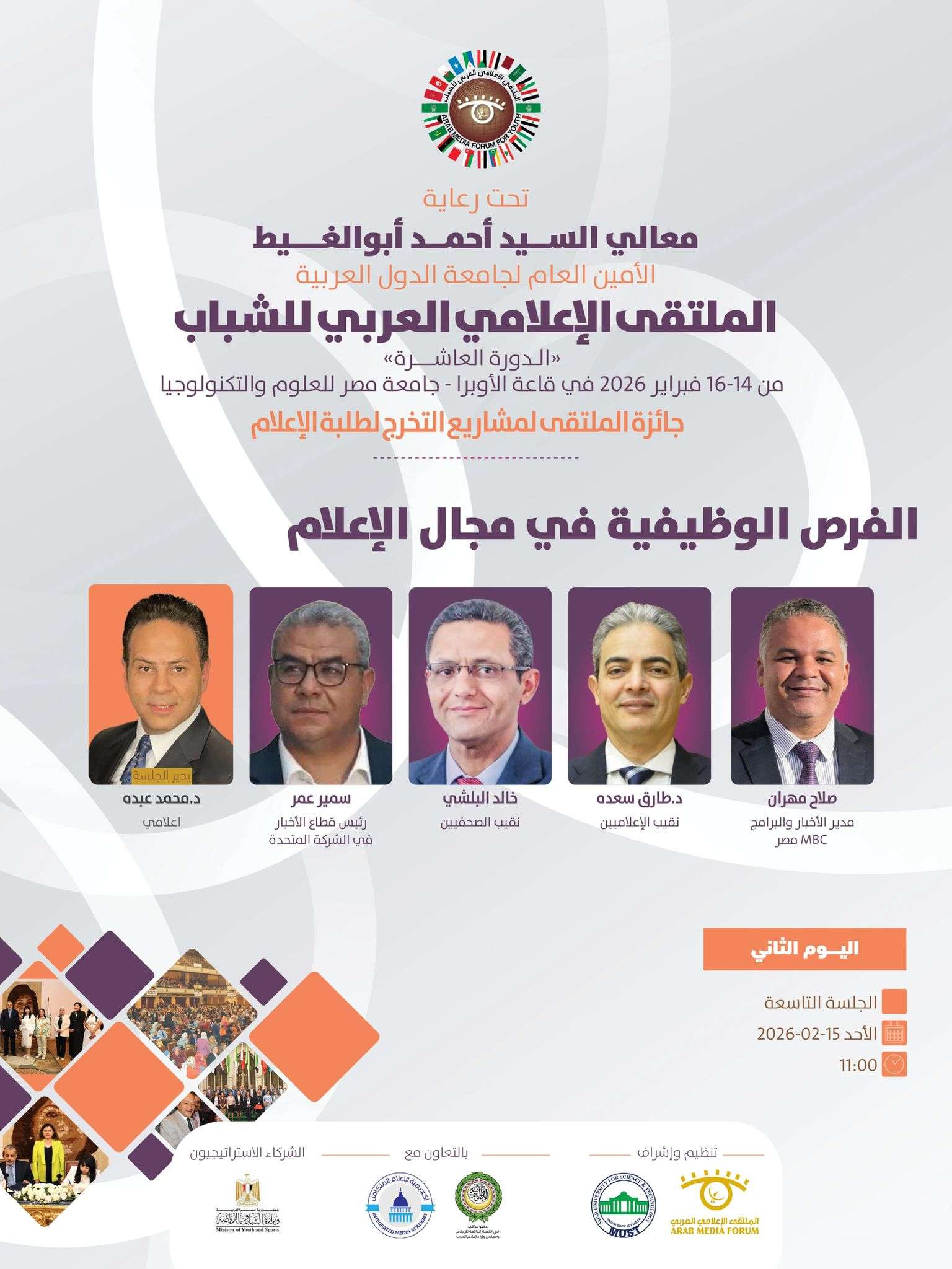 تنطلق فعاليات الملتقى الإعلامي العربي للشباب في دورته العاشرة الذي ينظمه الملتقى الإعلامي العربي بالتعاون مع جامعة مصر للعلوم والتكنولوجيا، وبرعاية من السيد أحمد أبو الغيط الأمين العام لجامعة الدول العربية، وذلك خلال الفترة ما بين 14 حتى 16 فبراير 2026.