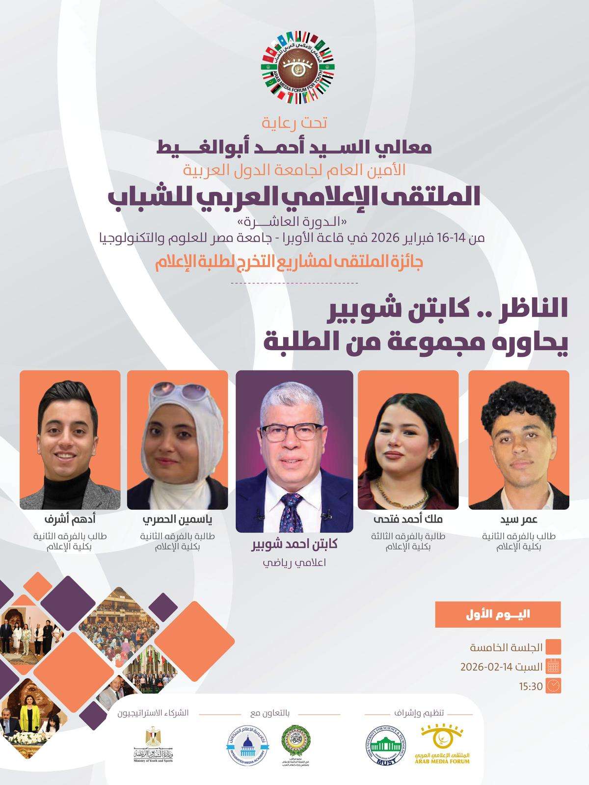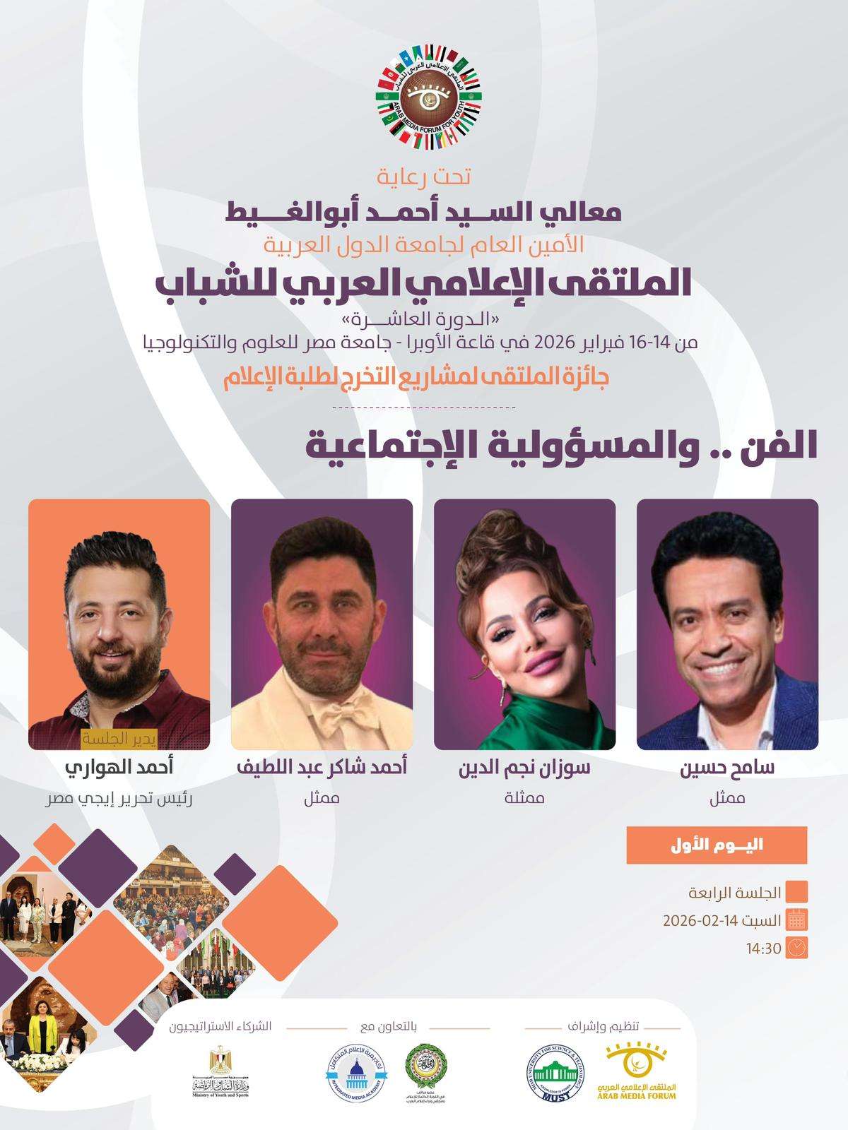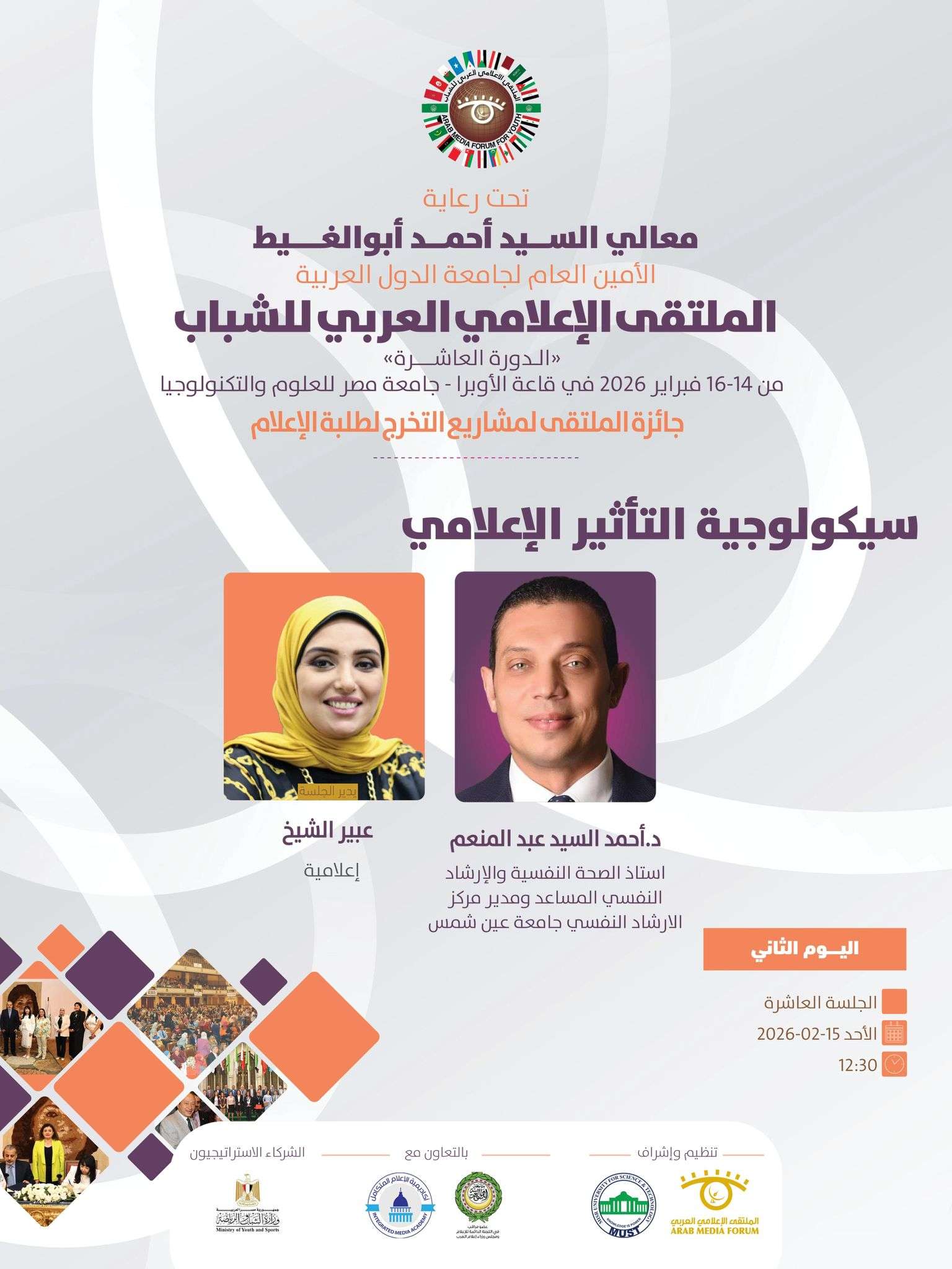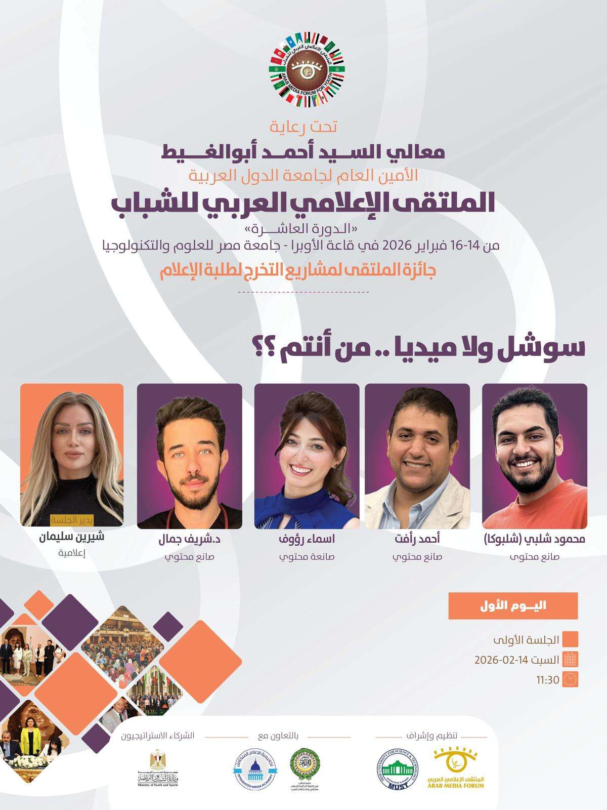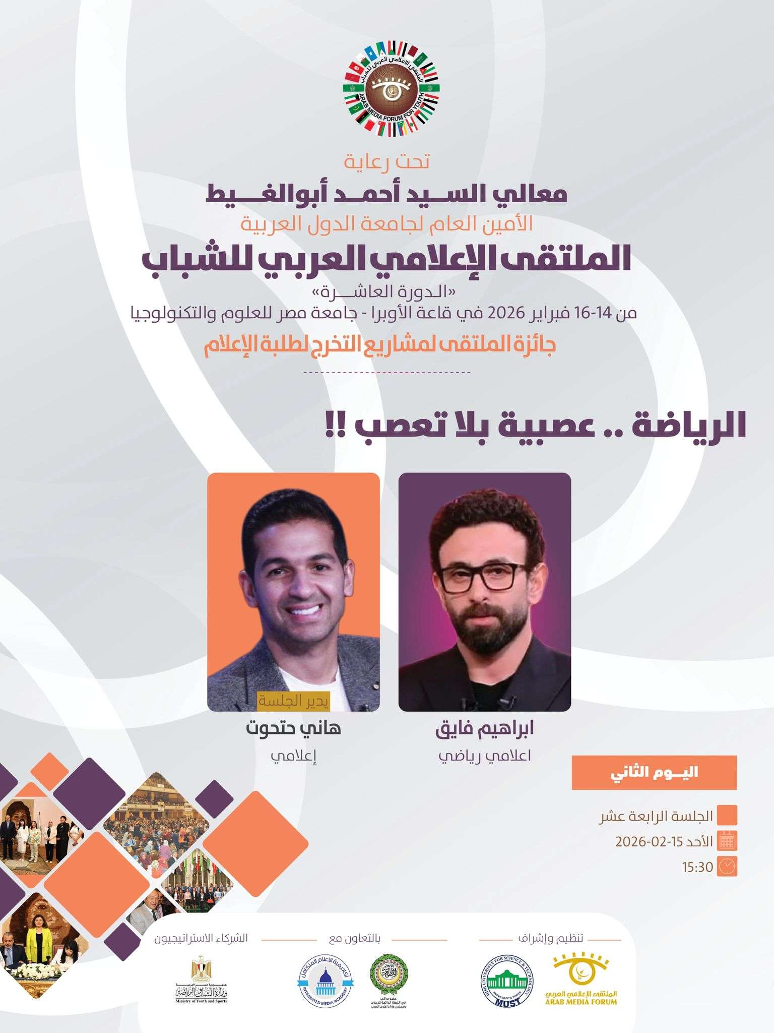 تنطلق فعاليات الملتقى الإعلامي العربي للشباب في دورته العاشرة الذي ينظمه الملتقى الإعلامي العربي بالتعاون مع جامعة مصر للعلوم والتكنولوجيا، وبرعاية من السيد أحمد أبو الغيط الأمين العام لجامعة الدول العربية، وذلك خلال الفترة ما بين 14 حتى 16 فبراير 2026.