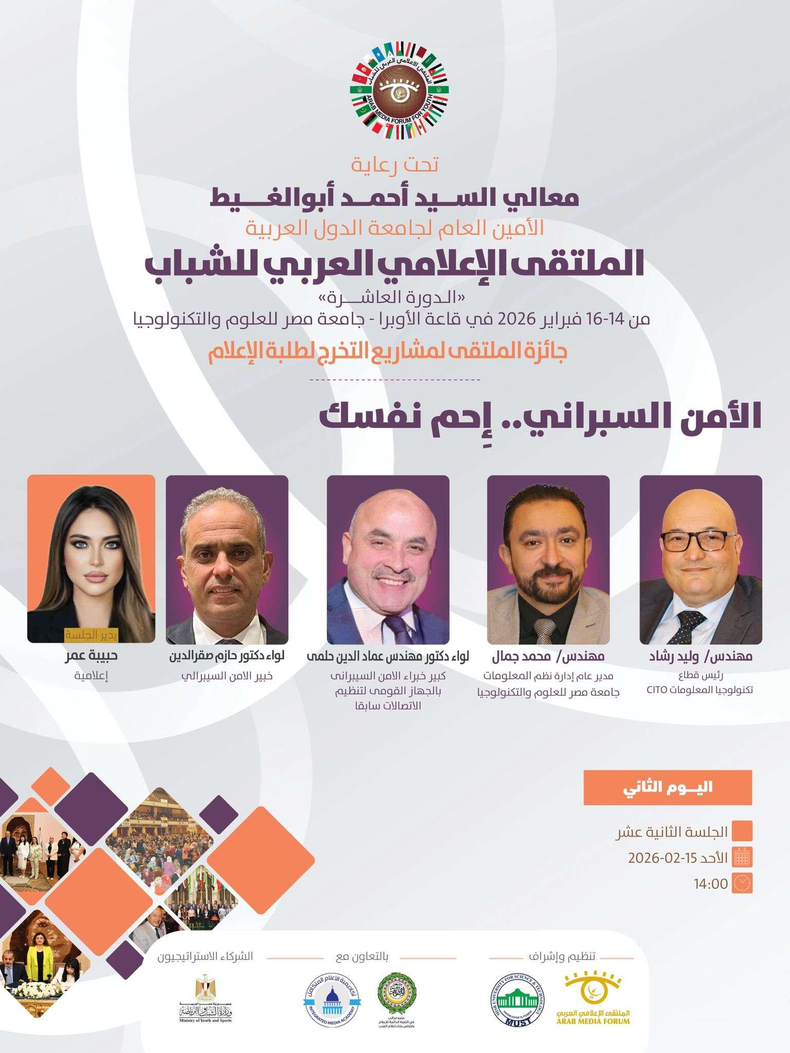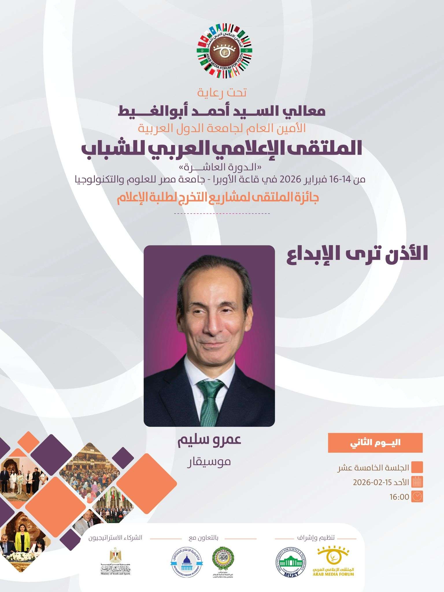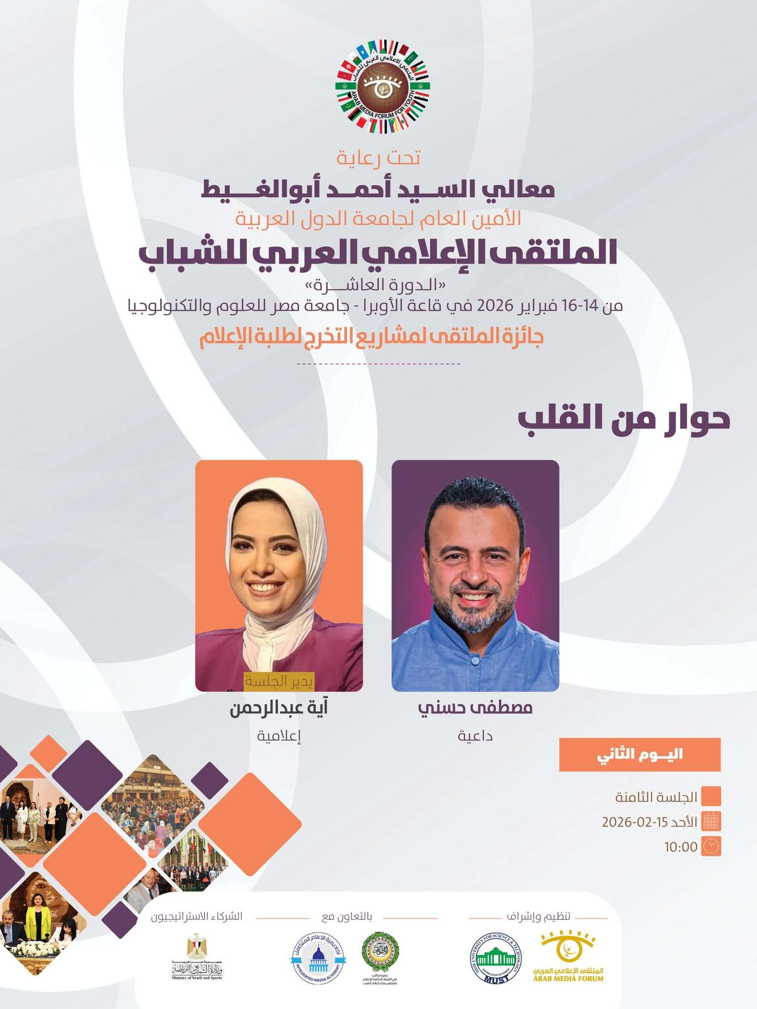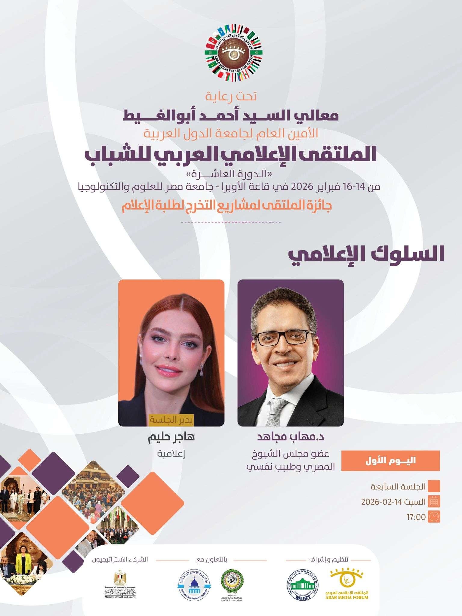 تنطلق فعاليات الملتقى الإعلامي العربي للشباب في دورته العاشرة الذي ينظمه الملتقى الإعلامي العربي بالتعاون مع جامعة مصر للعلوم والتكنولوجيا، وبرعاية من السيد أحمد أبو الغيط الأمين العام لجامعة الدول العربية، وذلك خلال الفترة ما بين 14 حتى 16 فبراير 2026.