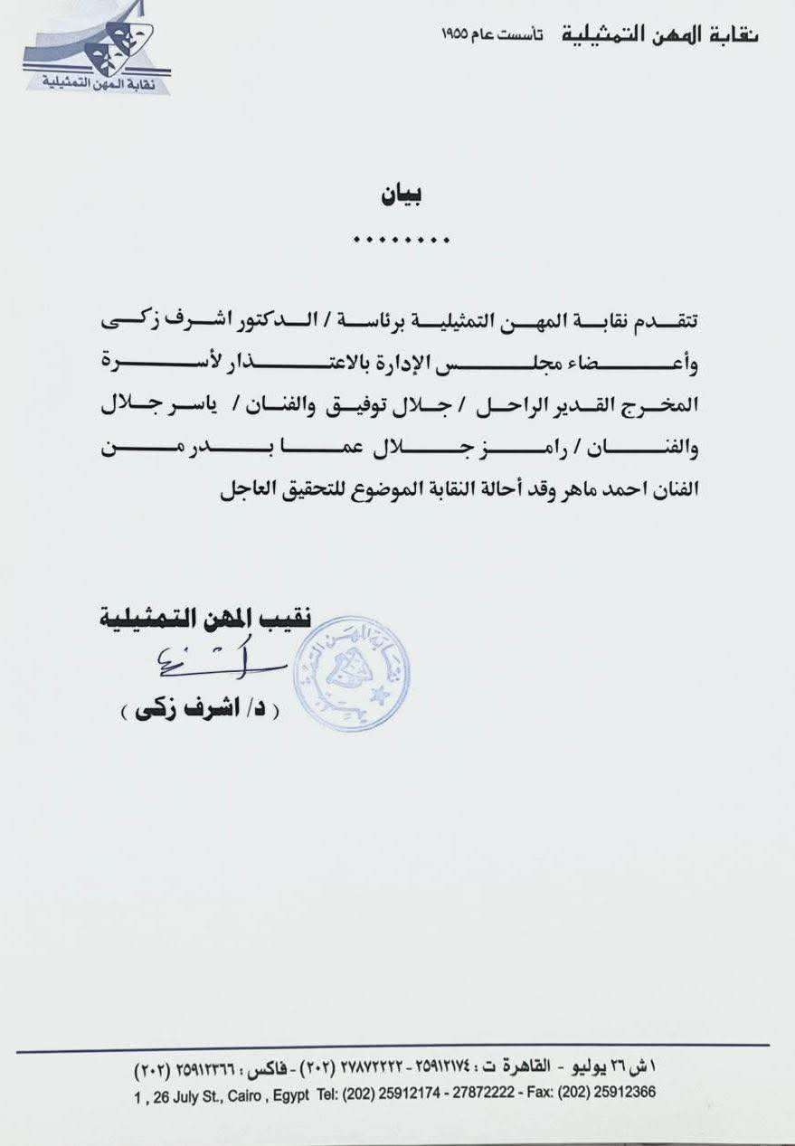 أصدرت نقابة المهن التمثيلية، برئاسة أشرف زكي، بيانًا رسميًا قدّمت خلاله اعتذارها لأسرة المخرج الراحل جلال توفيق، وكذلك للفنانين ياسر جلال ورامز جلال، عمّا صدر من الفنان أحمد ماهر.