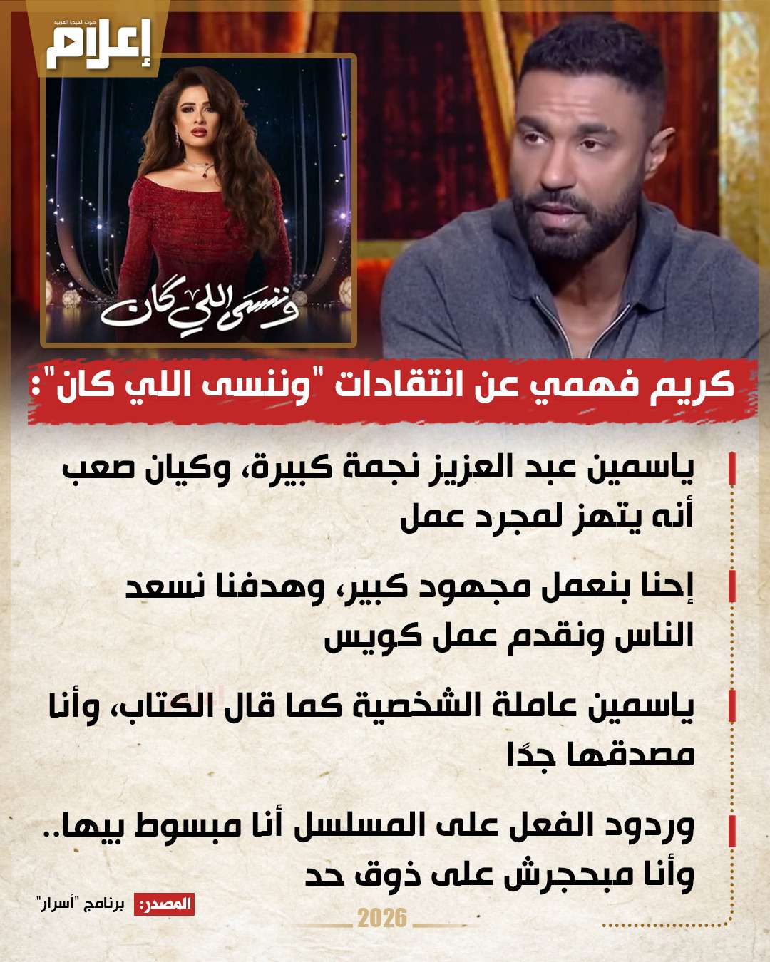 رد الفنان كريم فهمي على بعض الانتقادات الموجهة لمسلسل "وننسى اللي كان"، الذي يشارك في بطولته مع الفنانة ياسمين عبد العزيز، وينافس في موسم دراما رمضان 2026، مؤكدًا أنه لا يلتفت للجان أو الآراء المتداولة على السوشيال ميديا، وأن ما يهمه في النهاية هو رأي الجمهور في الشارع.