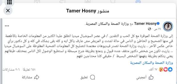كتب "حسني" عبر حسابه الرسمي عبر موقع التواصل الاجتماعي "فيس بوك": "إلى وزارة الصحة الموقرة مع كل الحب والتقدير: في عصر السوشيال ميديا انطلق علينا الكثير من المعلومات الخاصة بالأطعمة في منها الصحيح والخاطئ والناس في حالة تشتت والمريض مش عارف يأكل إيه، وكله بقى يشكك في كله، وكل دكتور برأي خاص عكس الآخر".