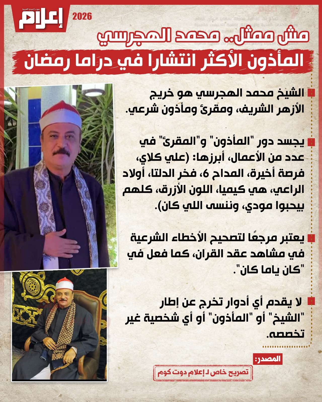 إنه الشيخ محمد الهجرسي، خريج الأزهر الشريف، والمأذون والمقرئ الحقيقي الذي قرر أن ينقل هيبة "المشيخة" من الواقع إلى الشاشة.
