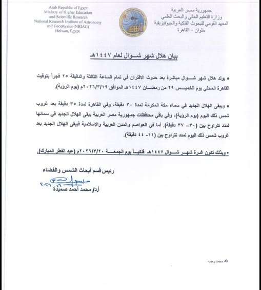 واختتم معهد البحوث الفلكية بيانه، مؤكدًا أن تكون غرة شهر شوال 1447 هجرياً فلكياً يوم الجمعة 20-3-2026 ( عيد الفطر المبارك)