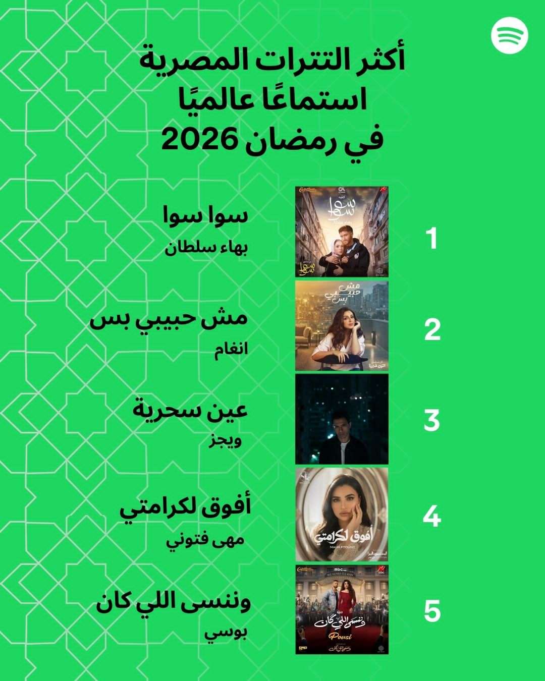 وفيما يلي قائمة التترات الرمضانية المصرية الأكثر استماعًا على Spotify: