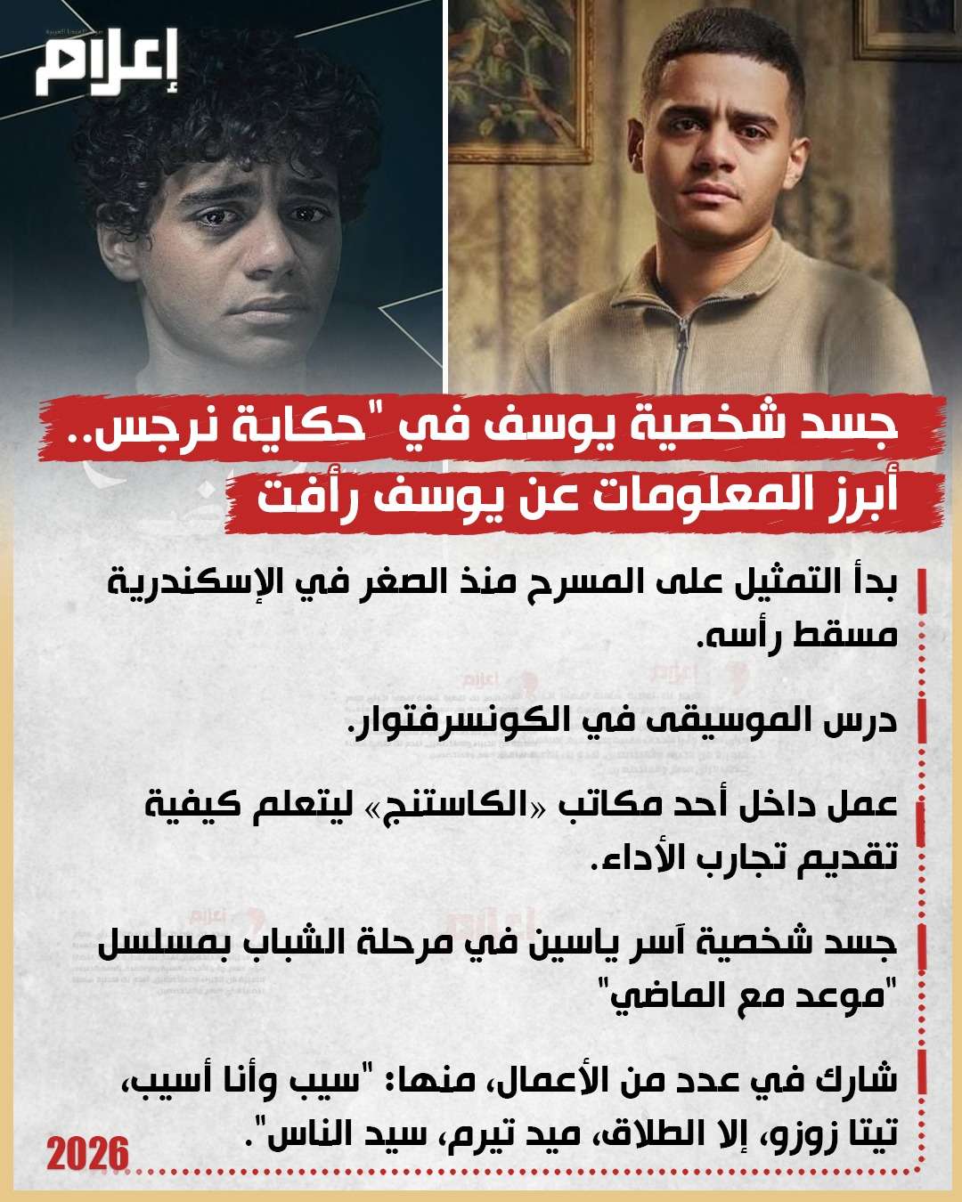 جسد الفنان الشاب يوسف رأفت شخصية يوسف الطفل الذي اخطتفته نرجس خلال أحداث مسلسل "حكاية نرجس" الذي يعرض خلال الموسم الرمضاني الحالي.