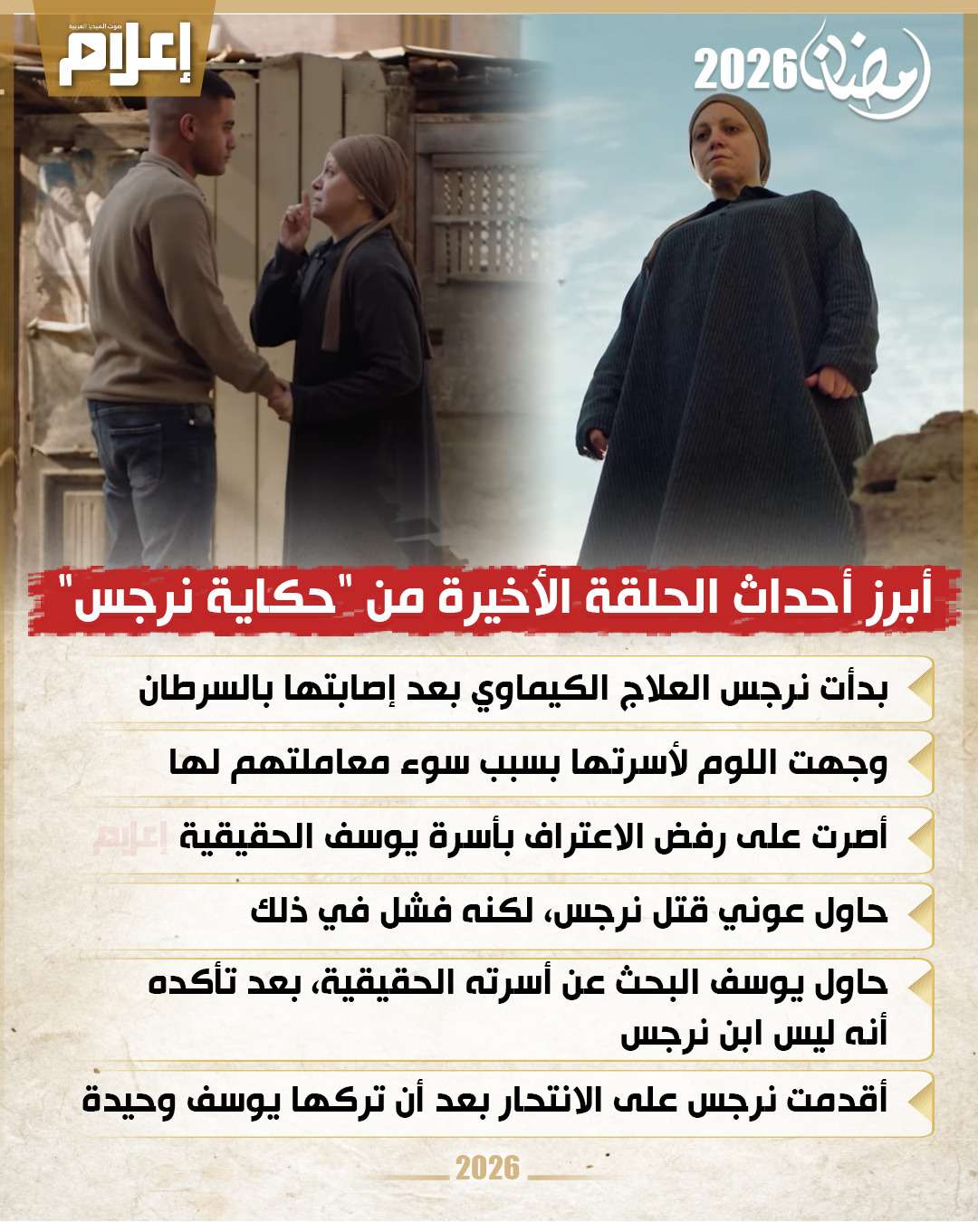 شهدت أحداث الحلقة الأخيرة من مسلسل "حكاية نرجس" العديد من الأحداث المهمة حيث بدأت بذهاب نرجس لتلقي العلاج الكيماوي بعد اكتشاف إصابتها بالسرطان، كما وجهت اللوم لأسرتها على سوء معاملتهم لها طيلة حياتها.